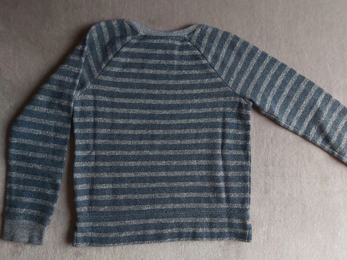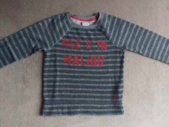 Bonjour, je vends un pull rayé bleu-gris pour fille. Manches longues. Taille 10 ans. 60 % Coton 40 % Polyester. Marque Roxy Girl. Prix 5 €.