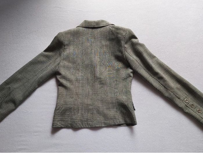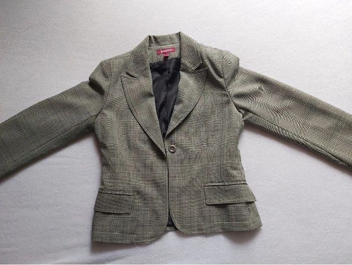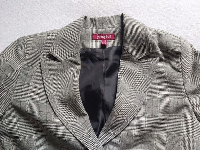 Bonjour, je vends une veste à carreaux pour femme. Fermeture par bouton. 2 poches imitation sur le devant. 96 % Polyester 4 % Élasthanne. Taille 38. Marque Jennyfer, en très bon état. Prix 10 €.