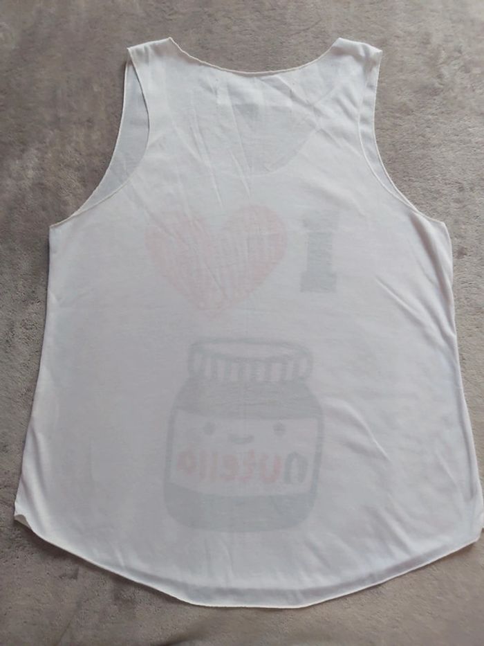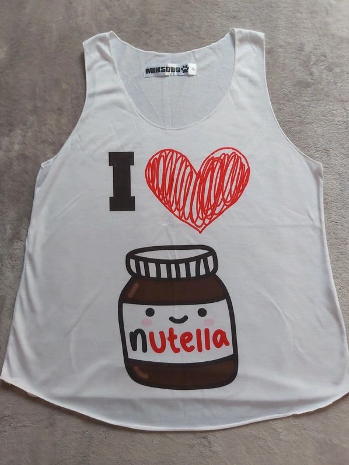 Bonjour, je vends un débardeur pour femme. Motif "I love Nutella". 100 % Polyester. Taille L (40). Marque Miksdog. Prix 15 €. Neuf, jamais mis.
