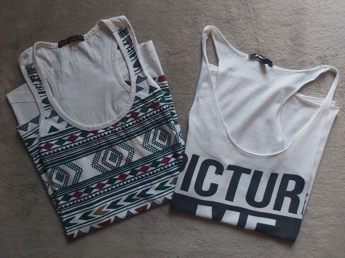 Bonjour, je vends un lot de 2 débardeurs pour femme. 100 % Coton. Taille M (38). Marque Jennyfer. Prix 2 € le lot. Un tout petit trou à l'arrière du 1er (voir photo).