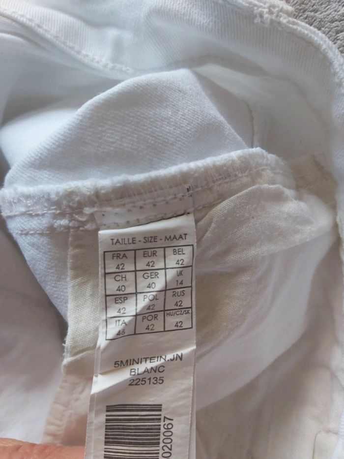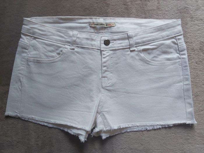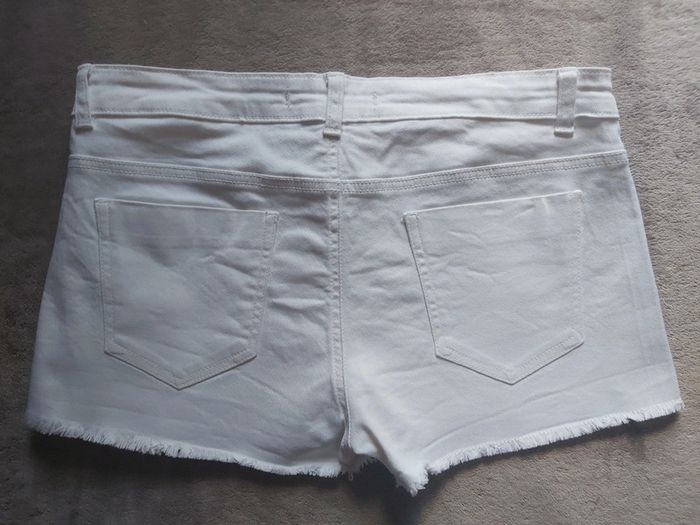 Bonjour, je vends un short court blanc pour femme. 2 poches avant + 2 poches arrière. Fermeture à glissière + bouton. 98 % Coton 2 % Élasthanne. Taille 42. Marque MIM. Prix 5 €.
