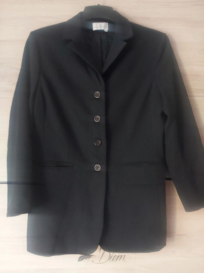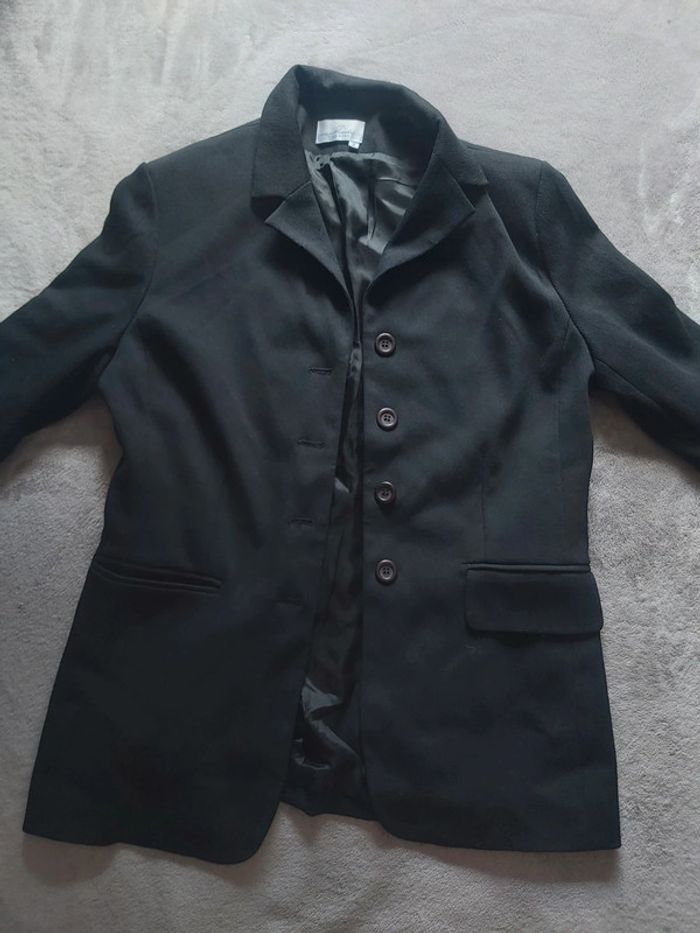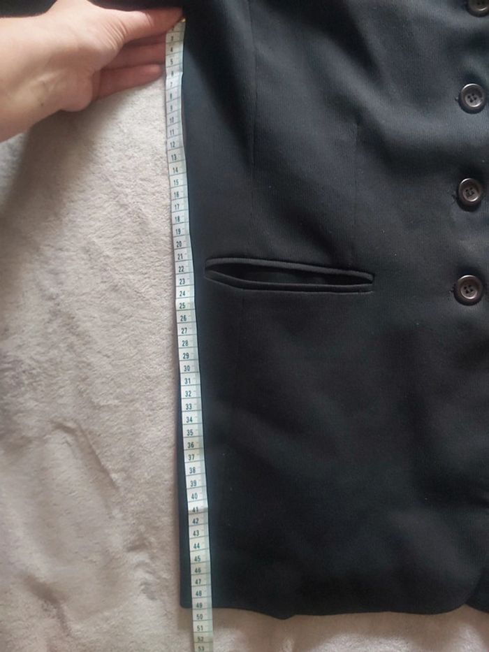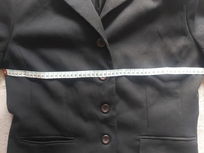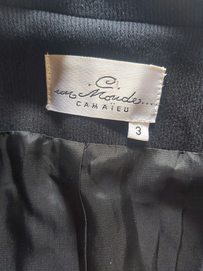 Bonjour, je vends une veste noire pour femme. Coupe ceintrée, fermeture à boutons. 2 poches avant (1 vrai + 1 imitation). 69 % Polyester 31 % Viscose. Taille 3 (42). Longueur aisselles 50 cm. Longueur aisselles au bas 49 cm. Marque Camaïeu. Prix 20 €.
