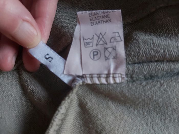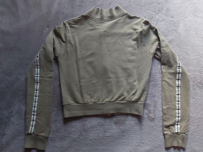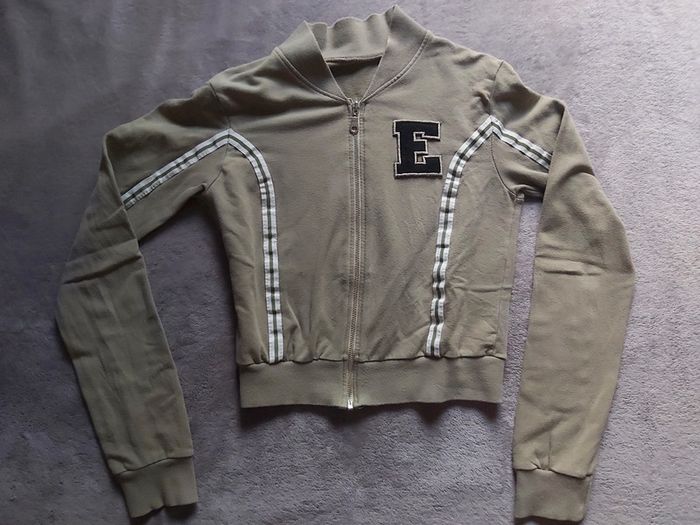 Bonjour, je vends une veste kaki claire zippée pour fille. Manches longues, effet court. Avec un "E". Taille S (36). 95 % Coton 5 % Élasthanne. Prix 2 €.