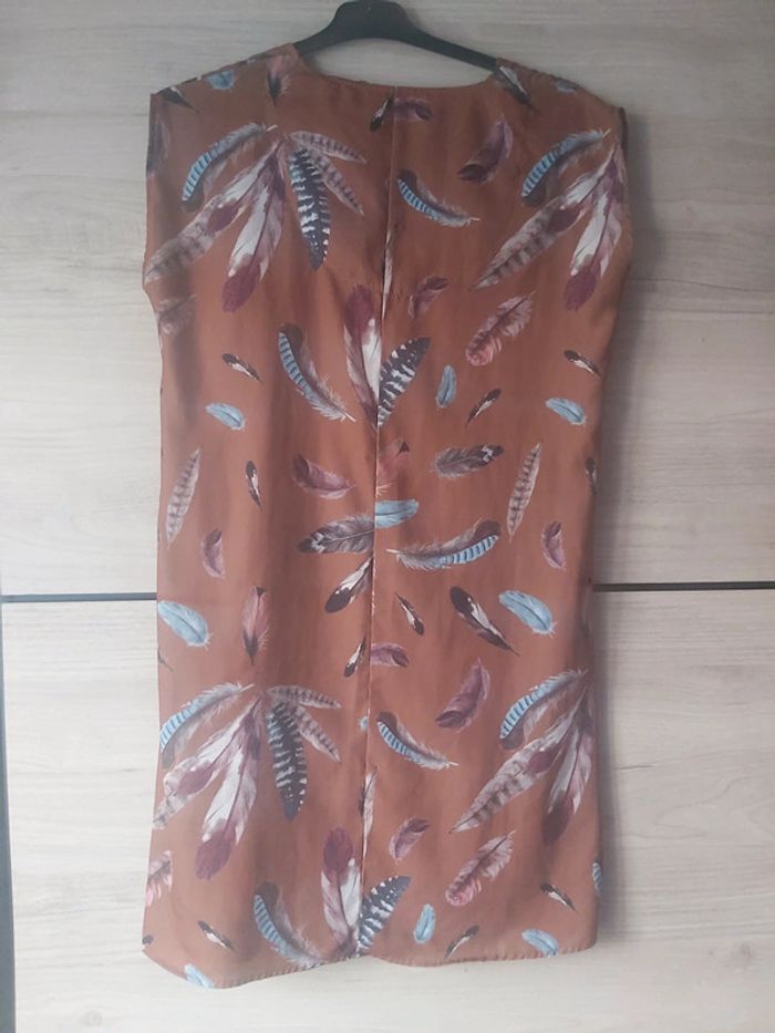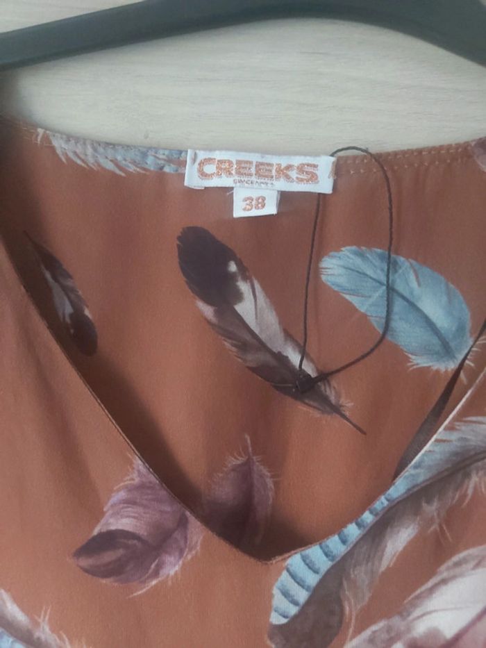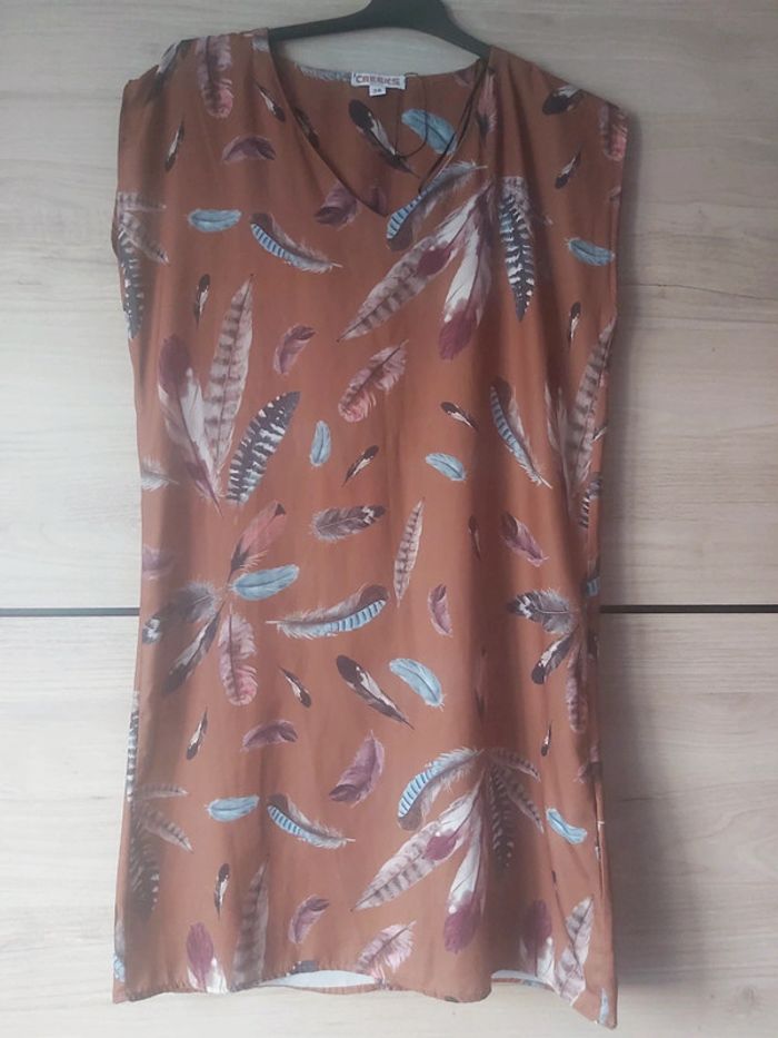 Bonjour, je vends une robe coloris marron avec des plumes. Col V, sans manches. 100 % Polyester. Taille 38. Marque Creeks. Prix 18 €.