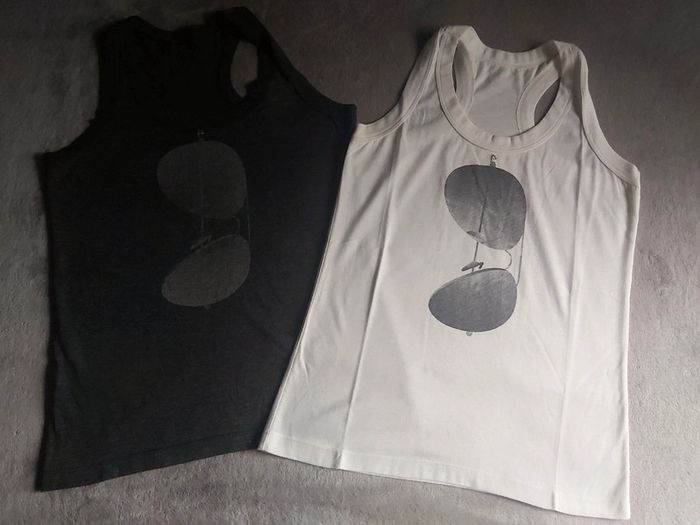 Bonjour, je vends un lot de 2 débardeurs gris anthracite et blanc pour femme. Motif Lunettes. 100 % Coton. Une petite tâche dans le bas du blanc à l'arrière (voir photo). Taille M (38). Prix 3 € les 2.