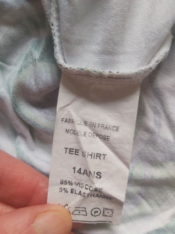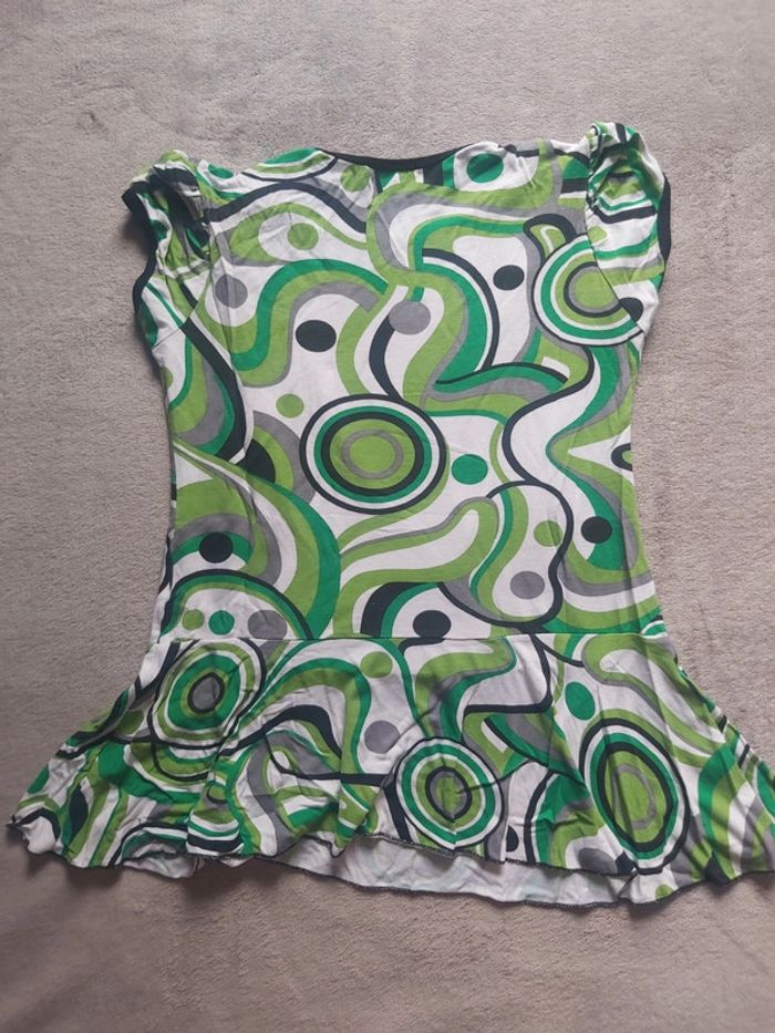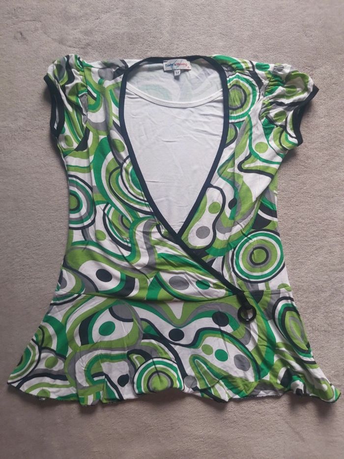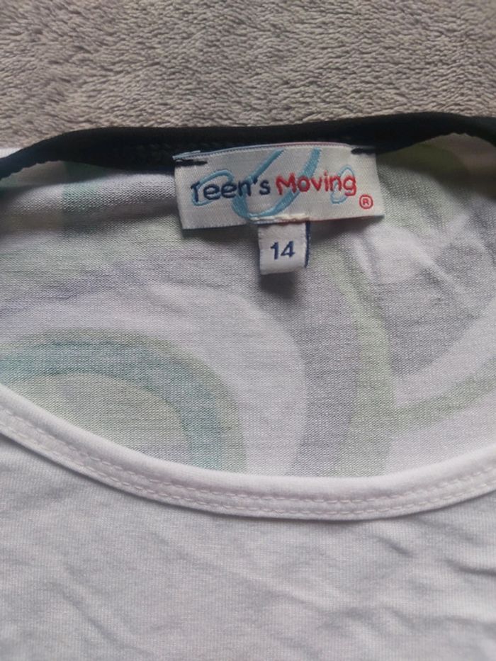 Bonjour, je vends une tunique volante pour fille. Manches courtes. Coloris vert, blanc et noir. 95 % Viscose 5 % Élasthanne. Taille 14 ans. Marque Teen's Moving. Prix 3 €.