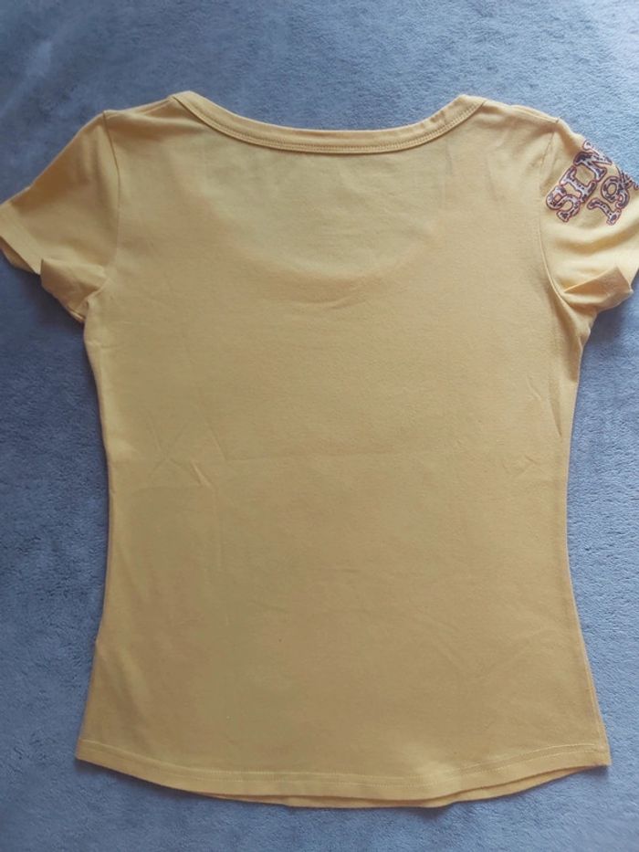Bonjour, je vends un T-Shirt jaune pour femme. Manches courtes. Logo Blason Chevaux . Taille S (36). 100 % Coton. Prix 3 €.