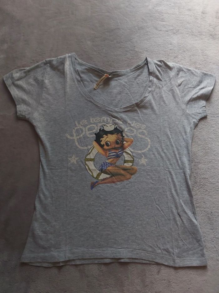 Bonjour, je vends un T-Shirt gris pour femme. Manches courtes. À l'effigie de Betty Boop. Taille L (40). 100 % Coton. Marque Le temps des cerises. Prix 12 €.