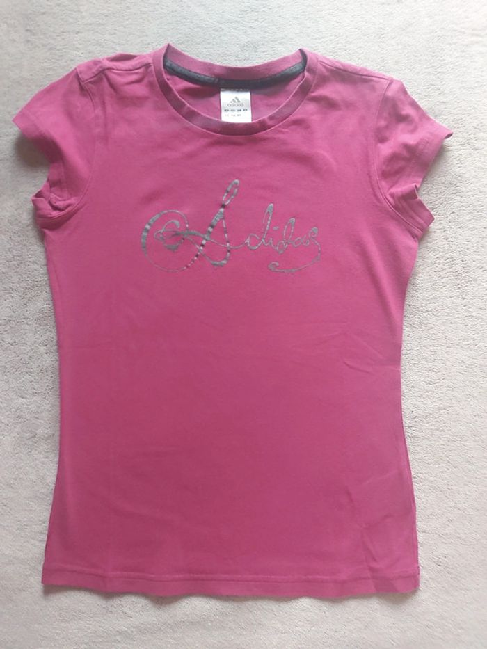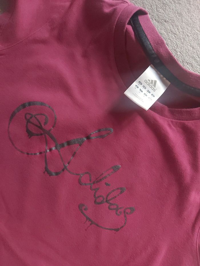 Bonjour, je vends un T-Shirt rose prune pour femme. Manches courtes. Logo Adidas en noir. Taille 38 (M). 95 % Coton 5 % Élasthanne. Marque Adidas. Prix 12 €.