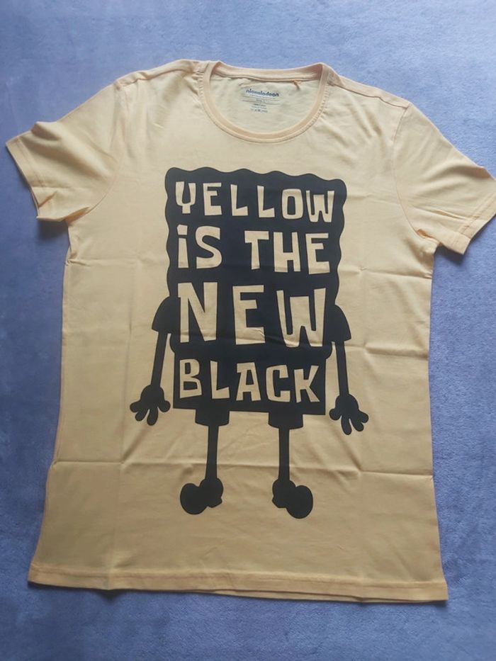 Bonjour, je vends un T-Shirt jaune "Bob l'éponge" mixte. Il est bien jaune, la photo change un peu la couleur. Manches courtes. Écrit "Yellow is the new black". Taille L (40). 100 % Coton. Marque Nickelodeon. Le T-Shirt est neuf. Prix 10 €.