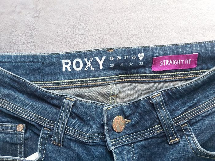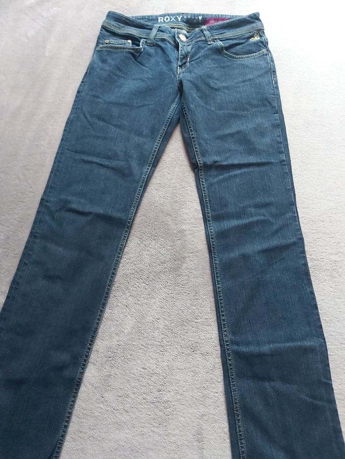 Bonjour, je vends un Jeans bleu pour femme. Fermeture à glissière + bouton. 2 poches avant + 2 poches arrière. 98 % Coton 2 % Élasthanne. Taille américaine 29 correspond au 38. Coupe Straight Fit. Marque ROXY. Prix 45 €.