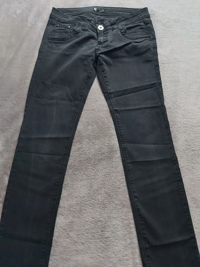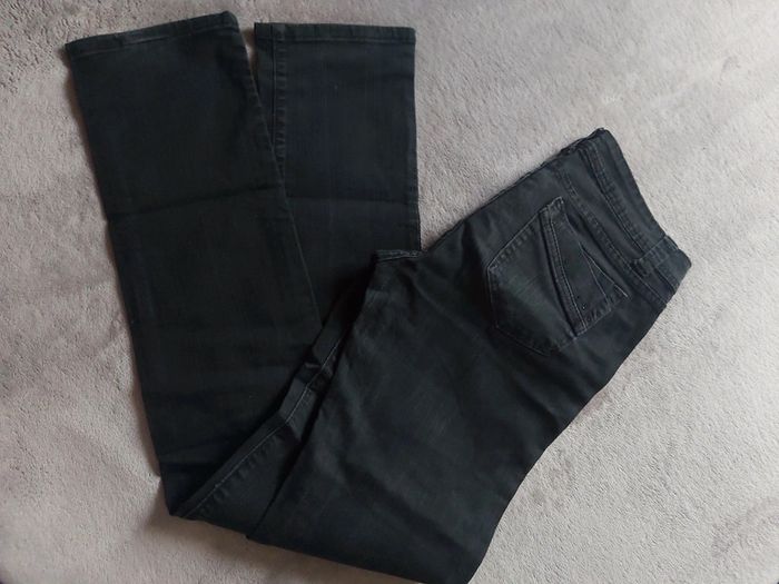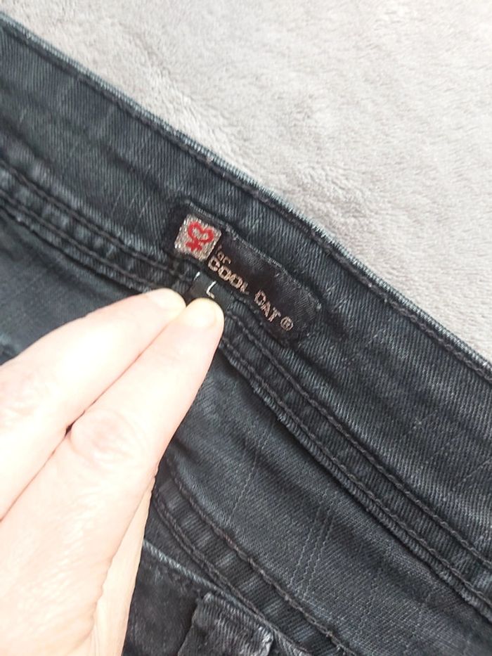 Bonjour, je vends un Jeans noir pour femme. Fermeture à glissière + bouton. 2 poches avant + 2 poches arrière. 95 % Coton 5 % Élasthanne. Taille L (40). Marque Cool Cat. Prix 8 €.