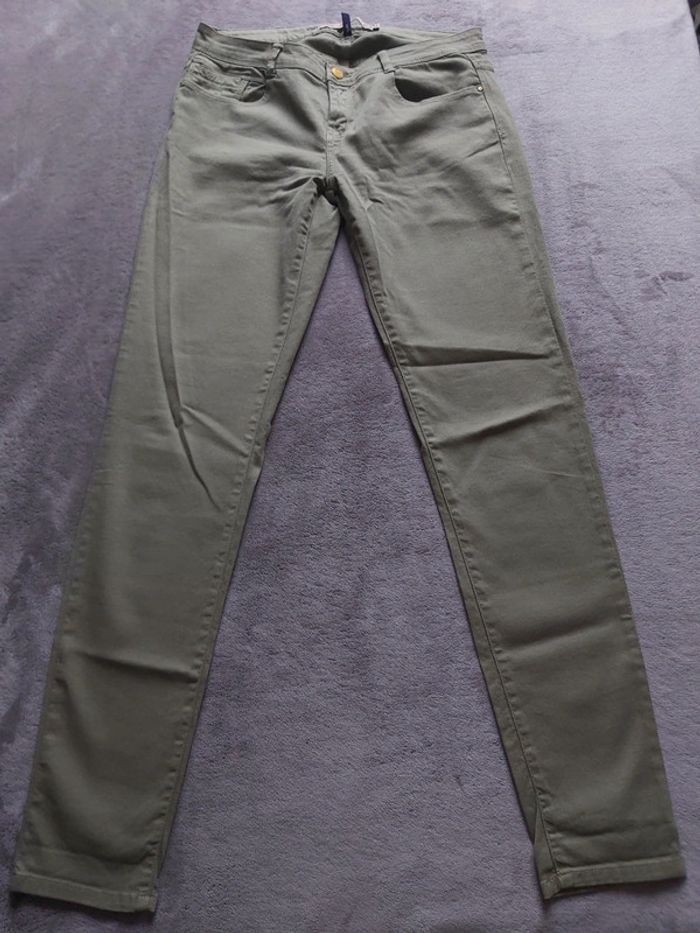 Bonjour, je vends un pantalon kaki clair pour femme. Fermeture à glissière + bouton. 2 poches avant + 2 poches arrière. 98 % Coton 2 % Élasthanne. Taille 40. Marque ZARA. Prix 7 €.