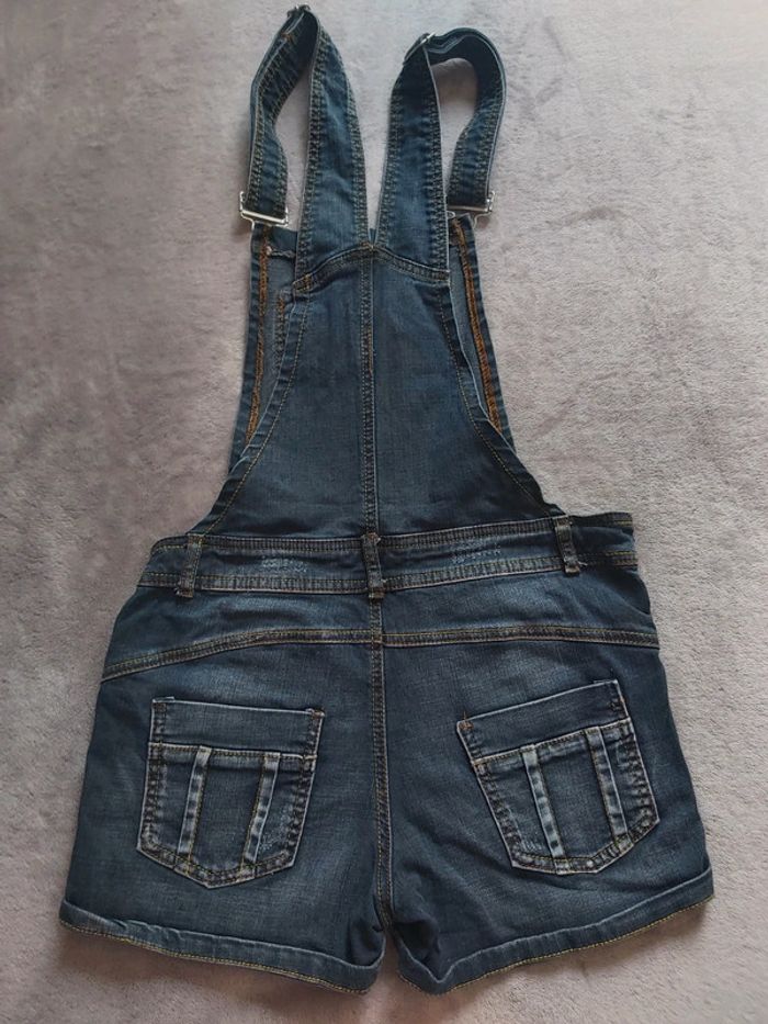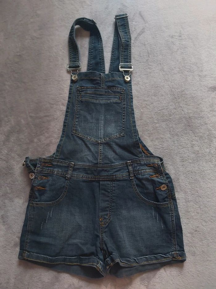 Bonjour, je vends une salopette short en Jeans pour femme. Short + haut à bretelles. 2 poches avant + 2 poches arrière + 1 poche en haut. Taille 34. 99 % Coton 1 % Élasthanne. Marque MIM. Prix 10 €.