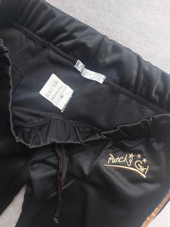 Bonjour, je vends un pantalon noir et doré pour femme. Taille élastiquée avec cordon. 1 poche arrière. 100 % Polyester. Taille 36. Marque MIM. Prix 8 €.