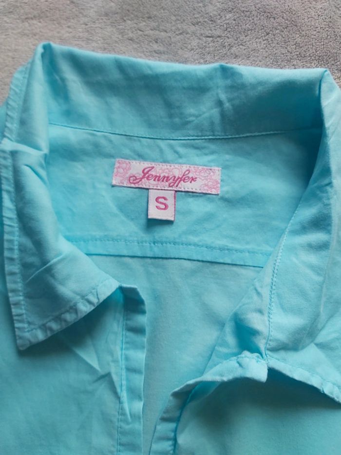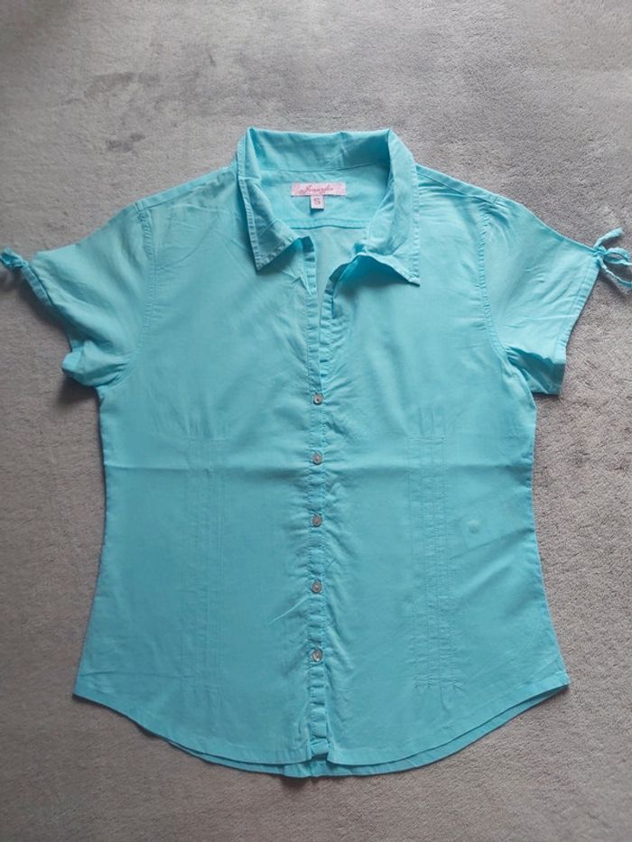 Bonjour, je vends une chemise bleue turquoise Été pour femme. Manches courtes avec nœud. Fermeture à boutons, avec col. 100 % Coton. Taille S. Marque Jennyfer. Prix 2 €.