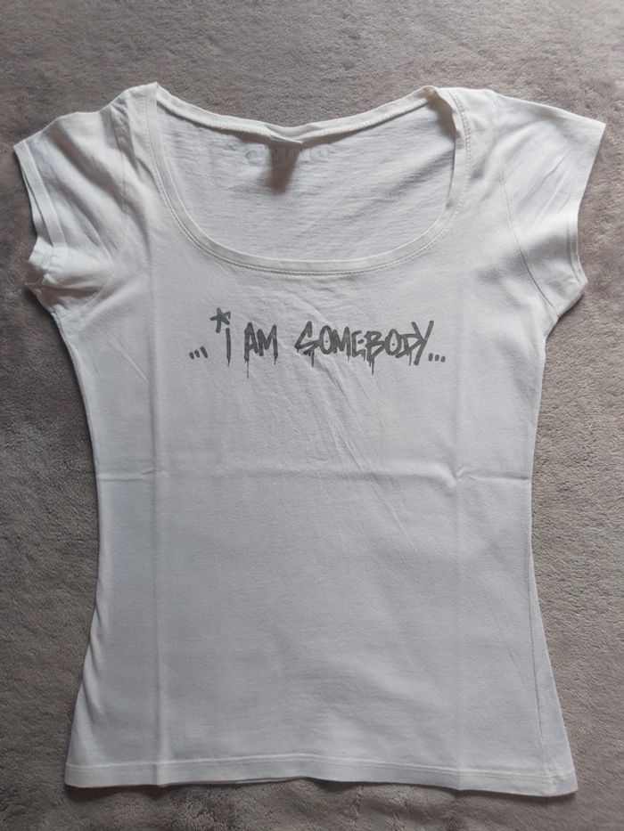 Bonjour, je vends un T-Shirt blanc pour femme. Manches courtes. Écrit "I am somebody..." de la chanteuse Diam's, acheté au concert lors de sa tournée. 100 % Coton. Taille M (38). Prix 10 €.