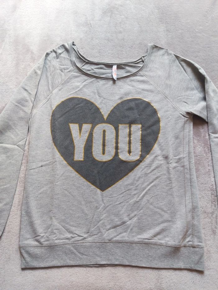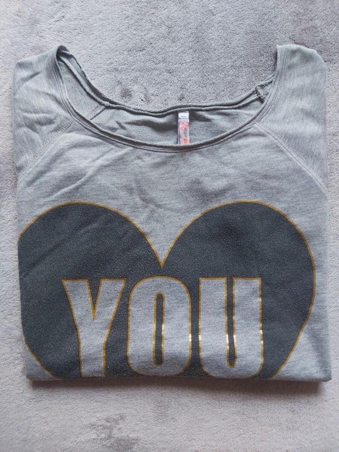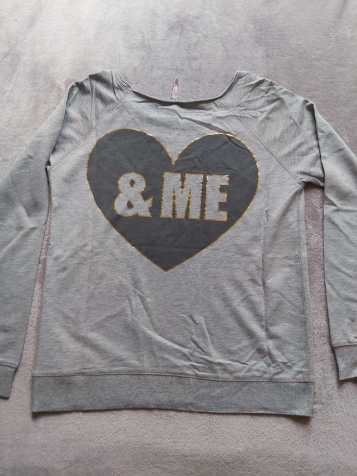 Bonjour, je vends un sweat gris, léger, manches longues. Taille M. Marque FB SISTER de chez New Yorker. Écriture "You & Me". Prix 3 €.