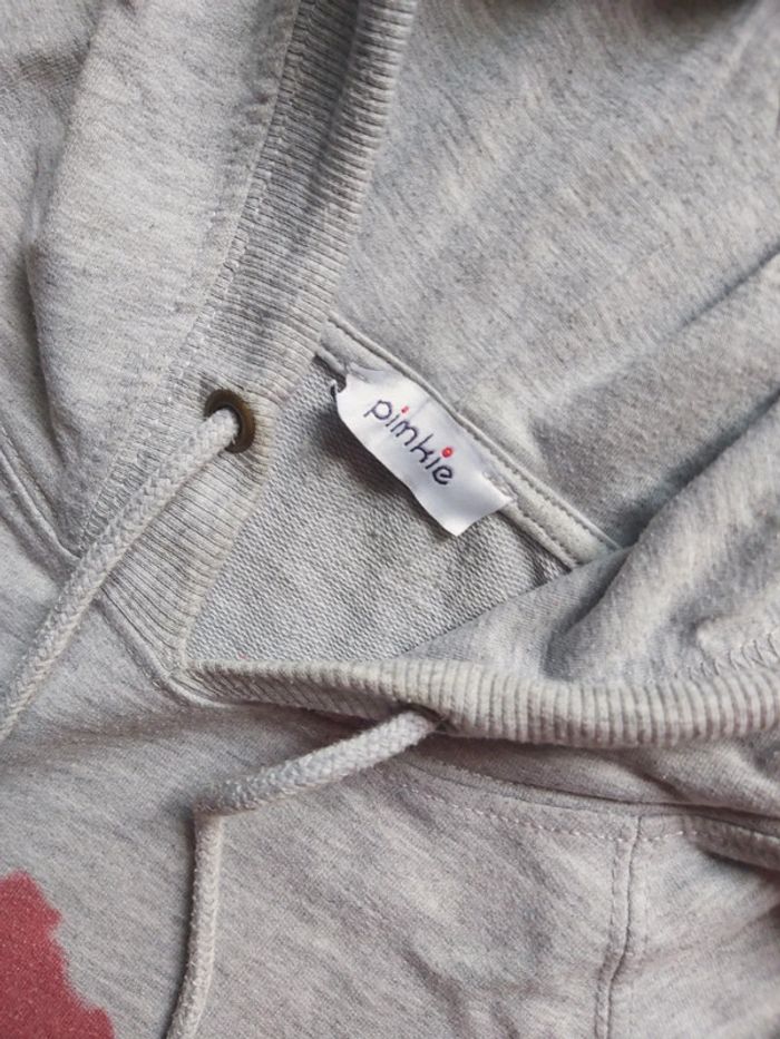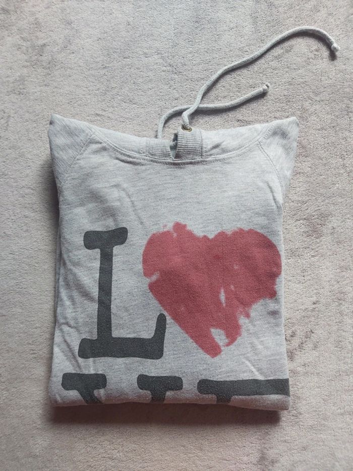 Bonjour, je vends un Sweat gris pour femme. Manches longues à capuche avec cordon. Motif Love. Taille S (36). 53 % Polyester 47 % Coton. Marque Pimkie. Prix 4 €.