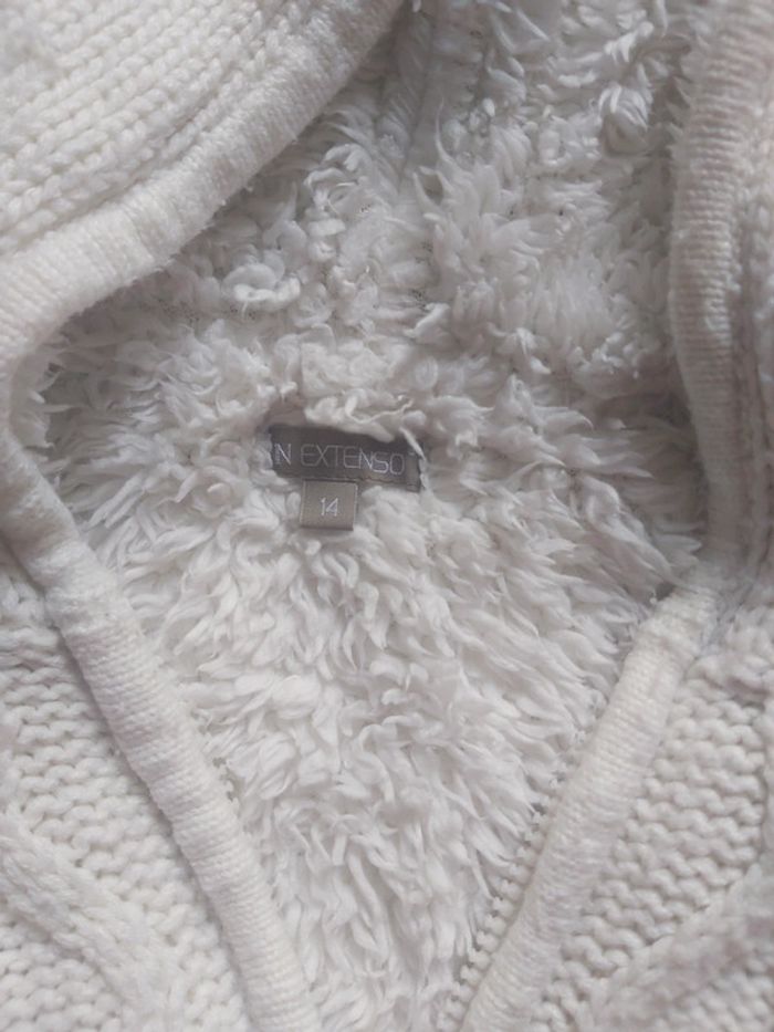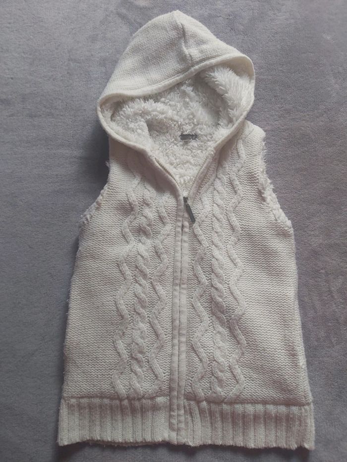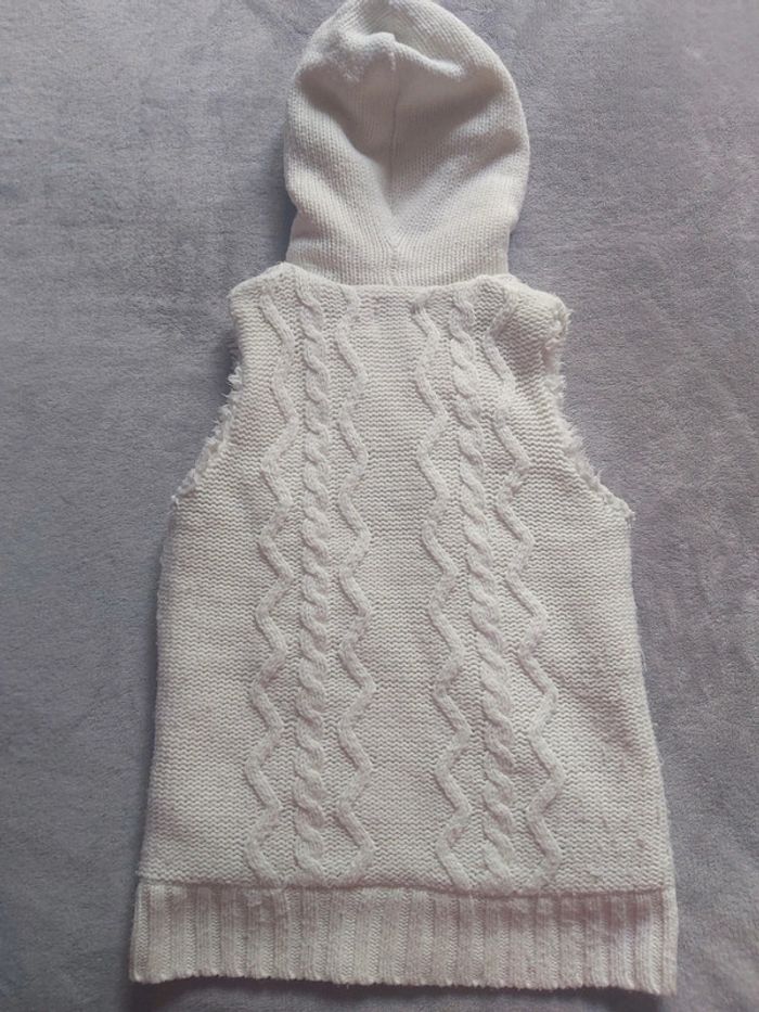 Bonjour, je vends un gilet sans manches, à capuche pour fille. Fermeture à glissière. 100 % Acrylique. Couleur écru. Taille 14 ans. Marque In Extenso. 2 poches. Prix 4 €.