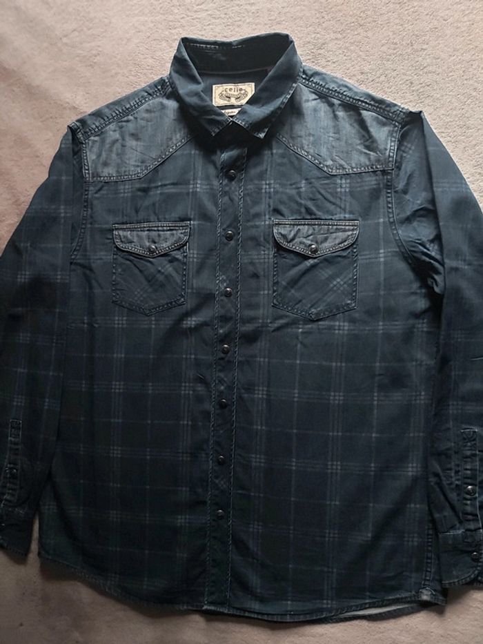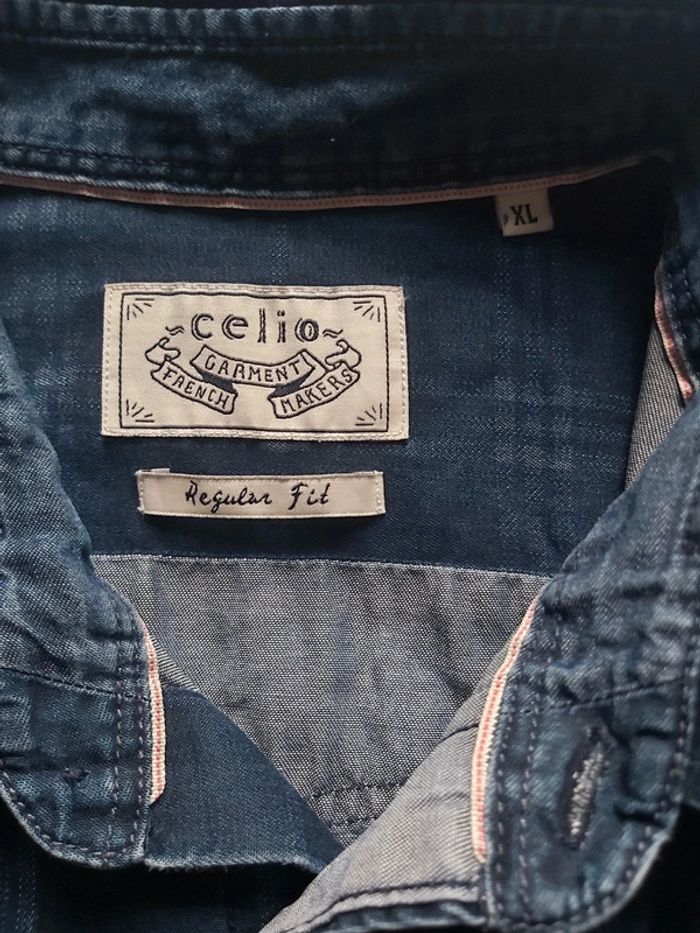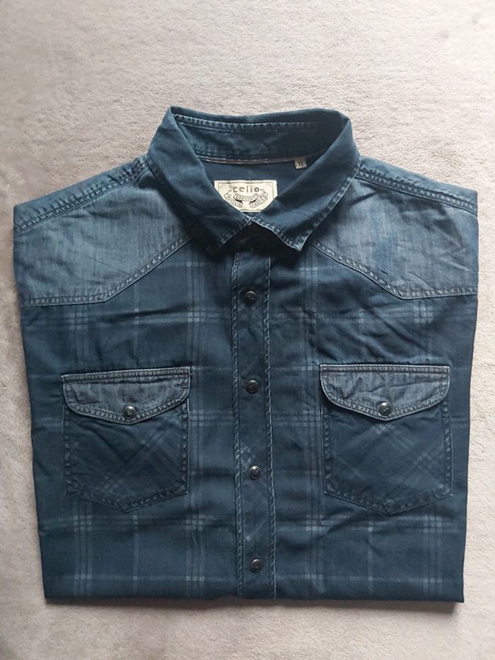 Bonjour, je vends une chemise bleue pour homme. Fermeture à boutons. Manches longues. 2 poches avant. Taille XL. Marque Célio. Couleur effet Jeans. Prix 8 €.