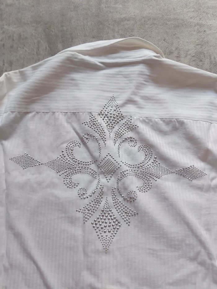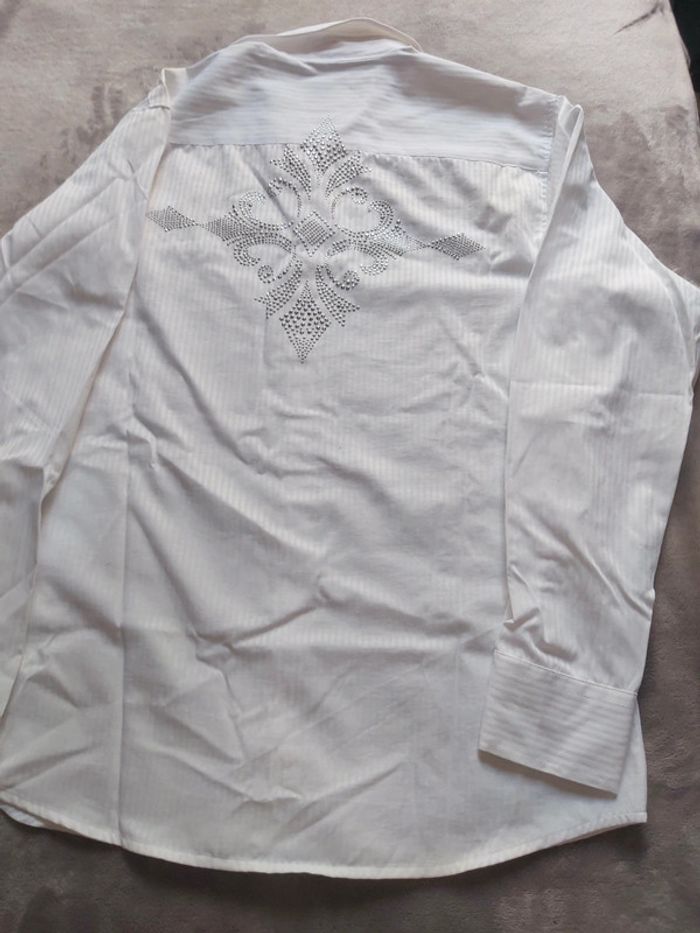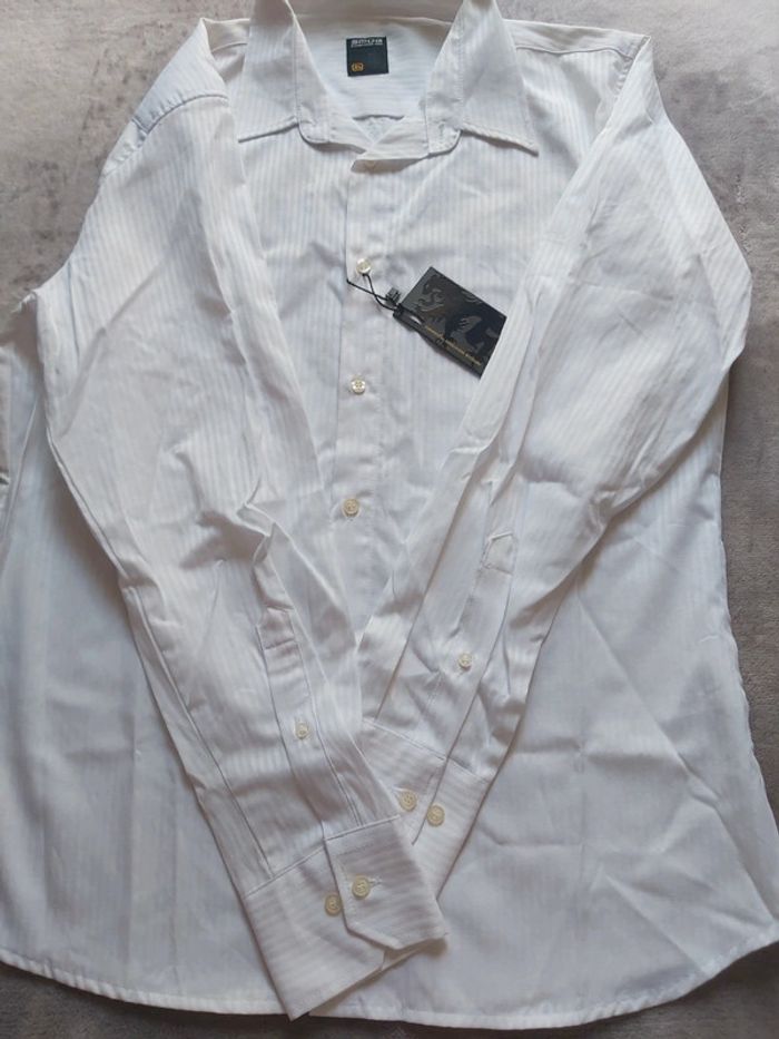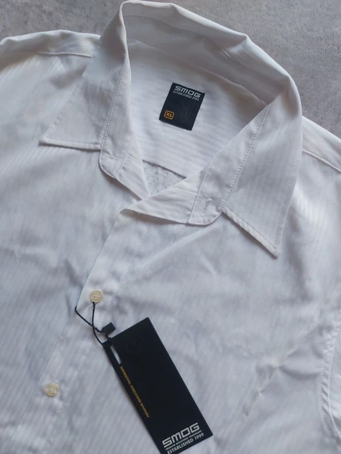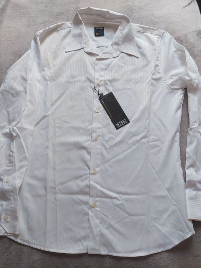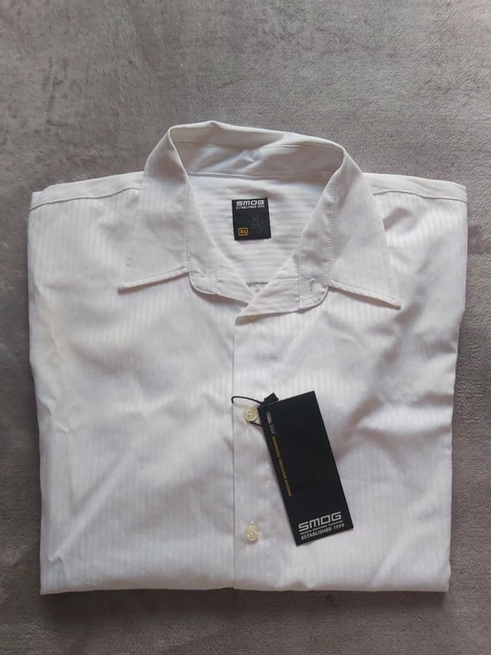 Bonjour, je vends une chemise blanche pour homme. Manches longues. Ouverture boutonnée. De légères rayures blanches et un logo sur le derrière. Taille XL. 60 % Coton 40 % Polyester. Marque Smog de chez New Yorker. Prix 15 €.