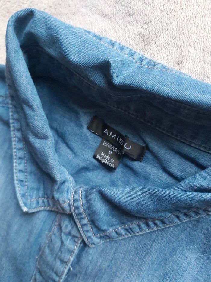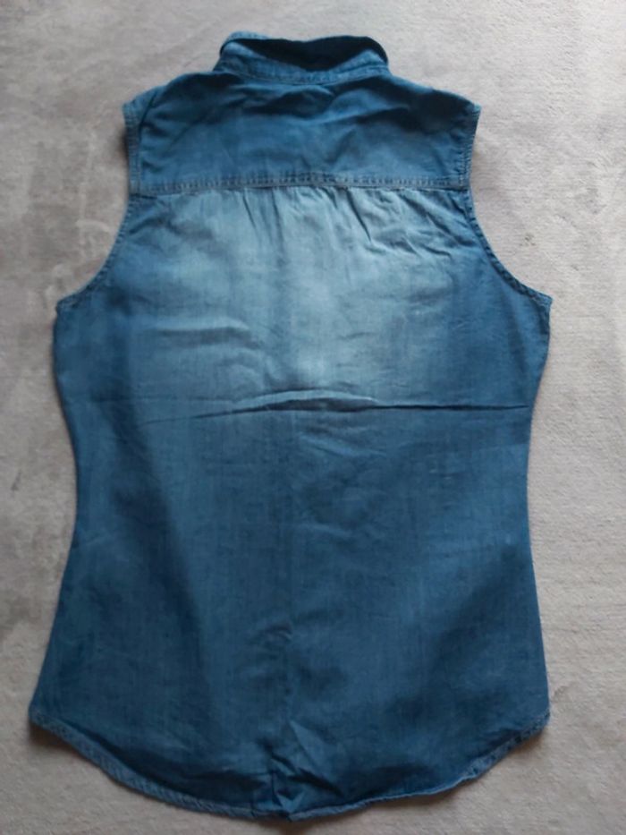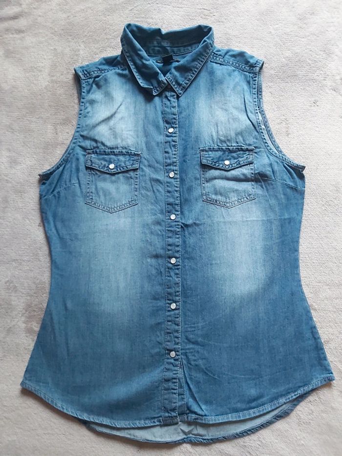 Bonjour, je vends une chemise en Jeans pour femme. Fermeture à boutons pression, avec col. 2 poches avant. Sans manches. 100 % Coton. Taille M (38). Marque Amisu de chez New Yorker. Prix 5 €.