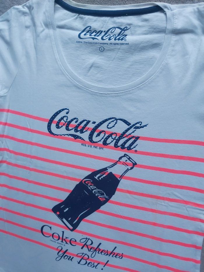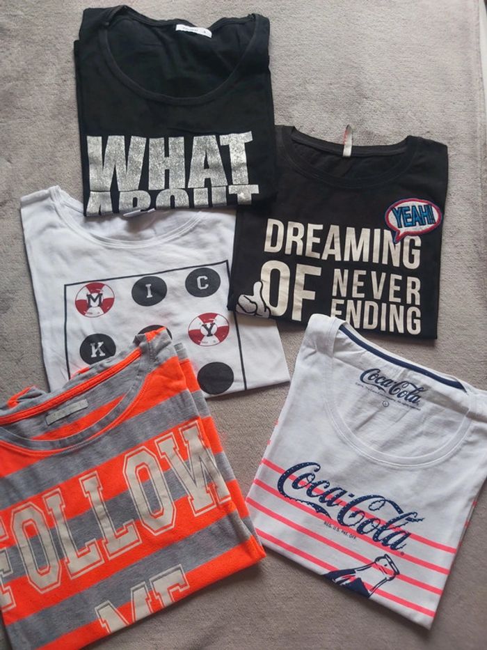 Bonjour, je vends un lot de 5 T-Shirts pour femme. Manches courtes. Taille L (40). Prix 10 € le lot. Derrière le blanc Coca Cola, des légers petits points (voir photo).