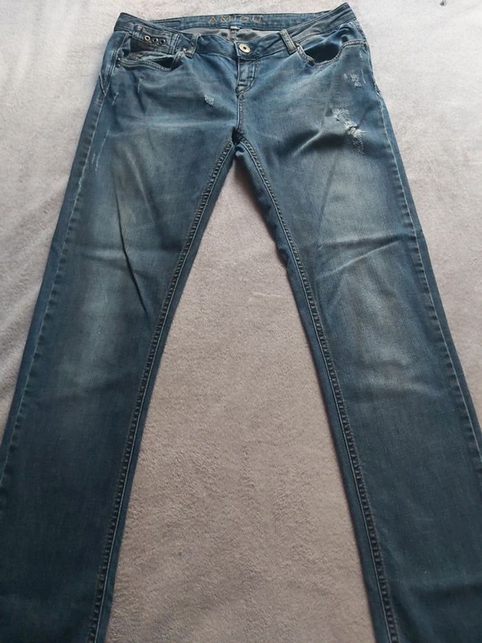 Bonjour, je vends un Jeans bleu pour femme. 2 poches avant + 2 poches arrière. Fermeture à glissière + bouton. Taille Américaine 32, équivalent au 40. Longueur taille 41 cm. Marque New Yorker. 98 % Coton 2 % Élasthanne. Prix 5 €.