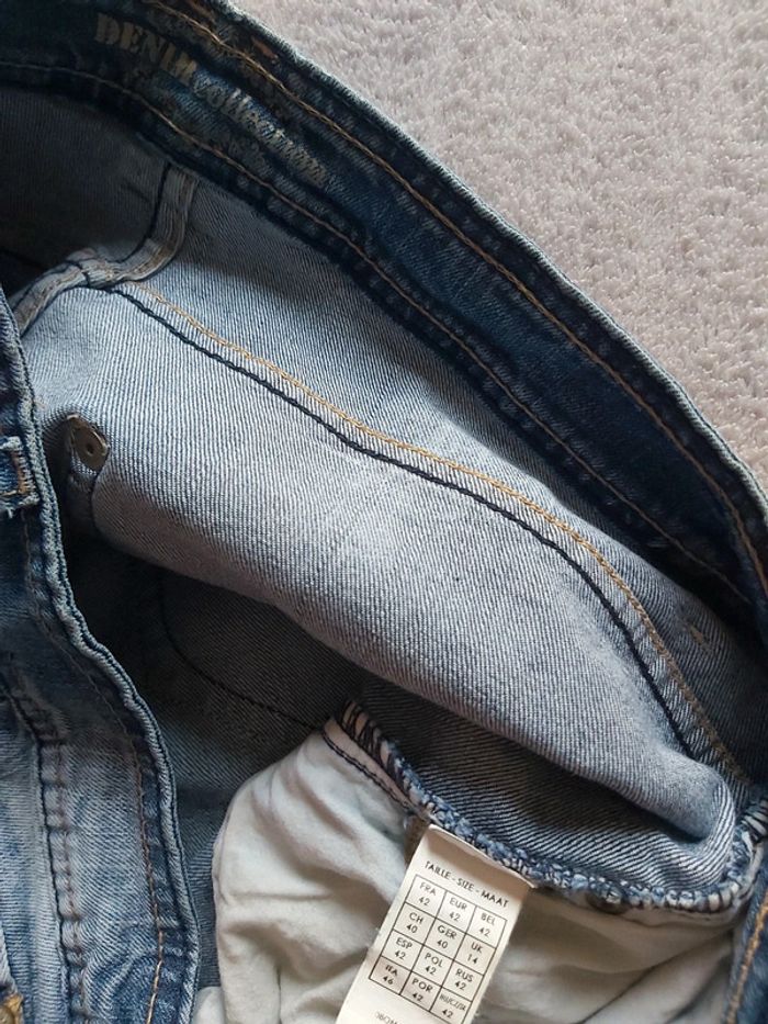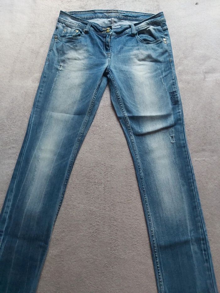 Bonjour, je vends un Jeans bleu pour femme. 2 poches avant + 2 poches arrière. Fermeture à glissière + bouton. Taille 42. Marque Mim. 98 % Coton 2 % Élasthanne. Prix 6 €.