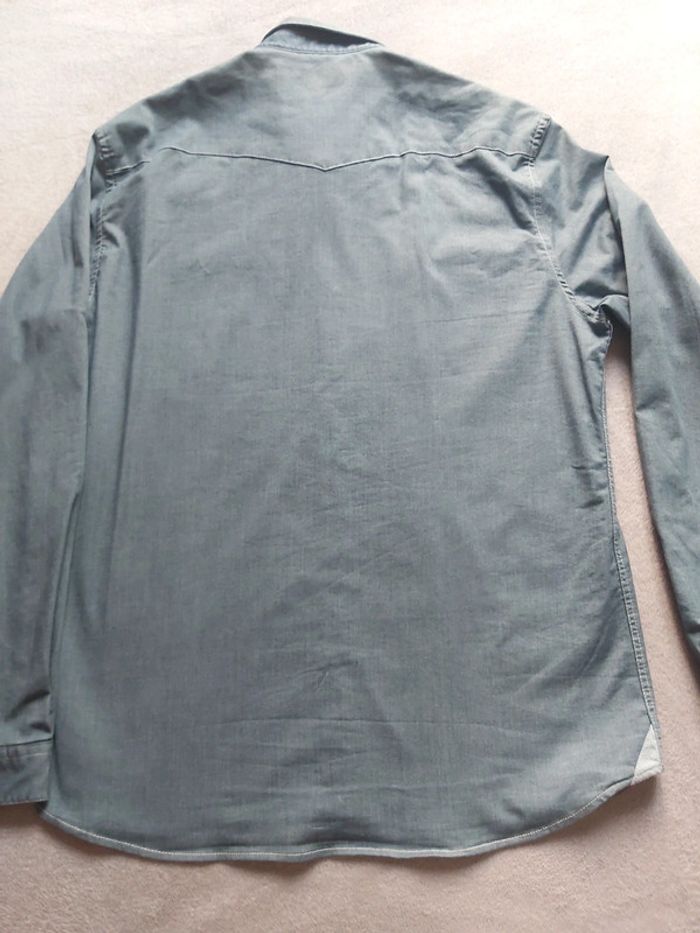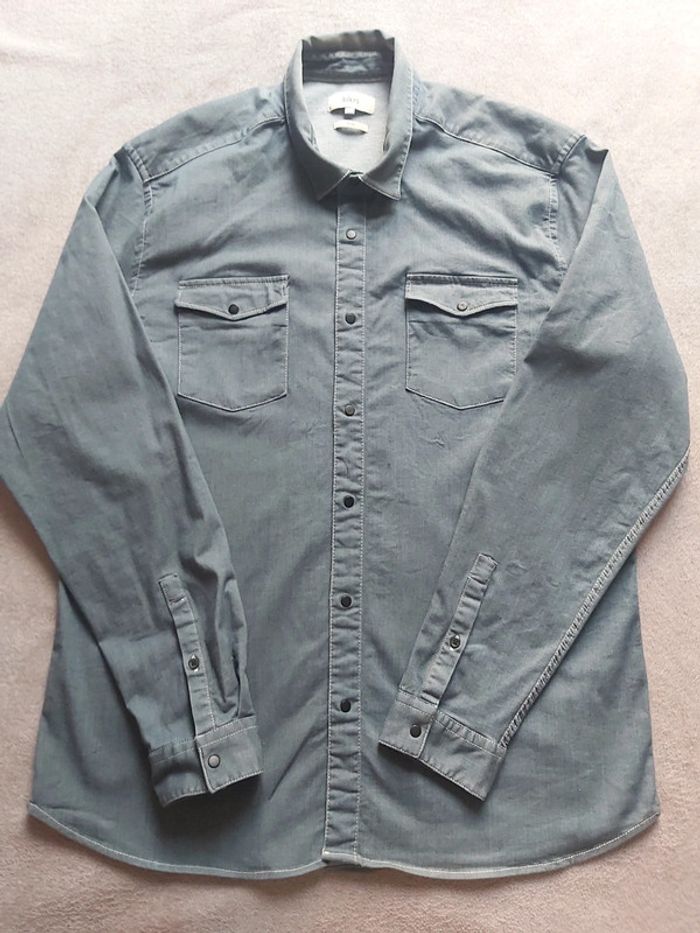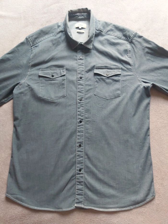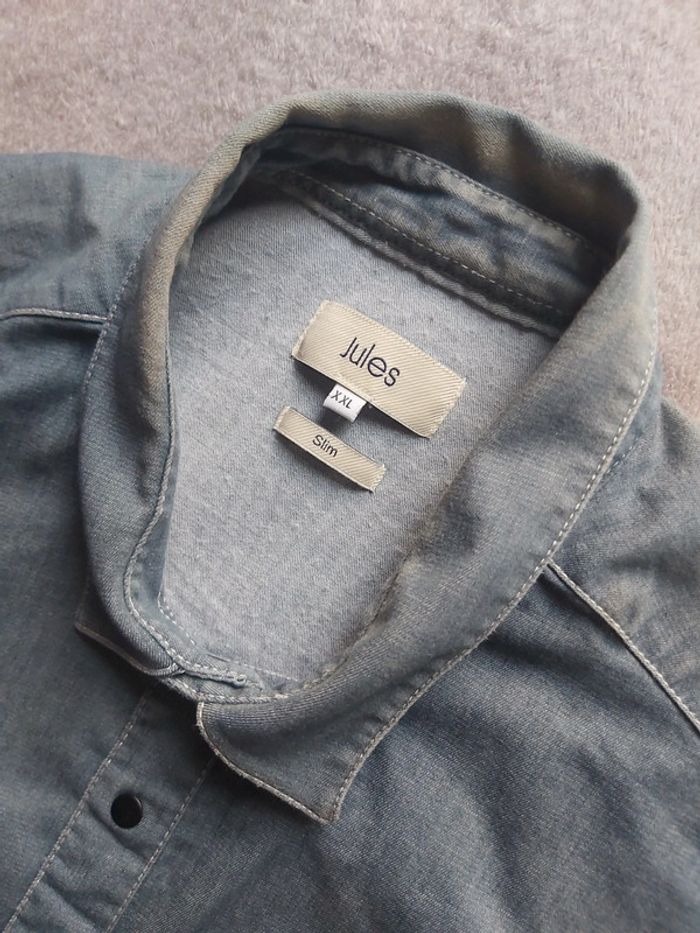 Bonjour, je vends une chemise en Jeans pour homme. Coloris gris. Manches longues. Fermeture à boutons. 2 poches devant. Taille XXL. Marque Jules. Le col est un peu décoloré. Prix 4 €.