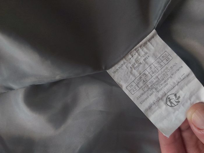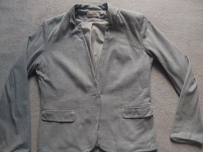 Bonjour, je vends une veste grise pour femme. Fermeture à bouton. 2 fausses poches avant. Taille 42. 100 % Coton. Doublure 100 % Polyester. Marque Camaïeu. Prix 10 €.
