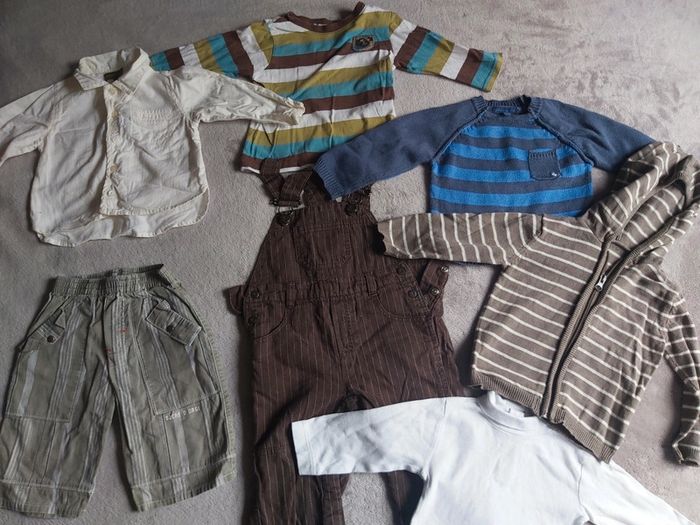 Bonjour, je vends un lot de vêtements pour bébé garçon. Pyjamas, bodys, pantalons, t-shirts, salopette, pulls, chemise, gilets. Taille 12 mois. Différentes marques. 25 € le lot