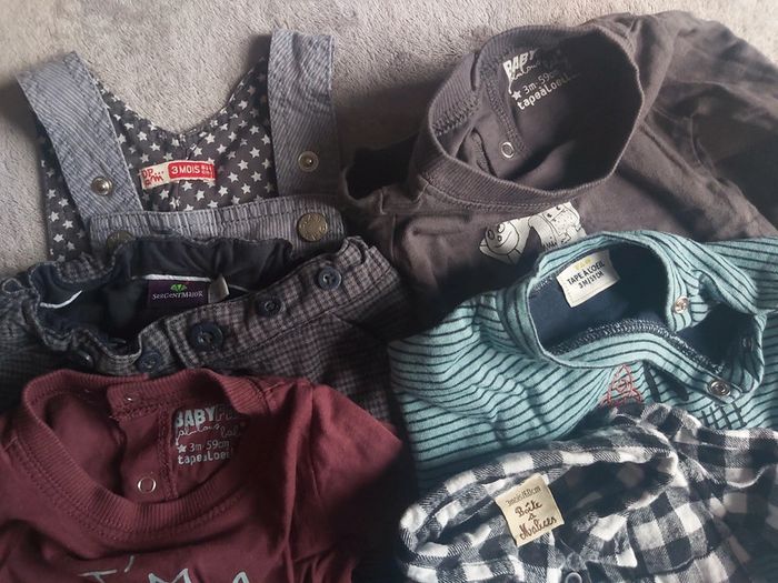 Bonjour, je vends un lot de vêtements pour bébé garçon. Pyjamas, bodys, pantalons, t-shirts, salopettes, manteau. Taille 3 mois. Différentes marques. 25 € le lot.