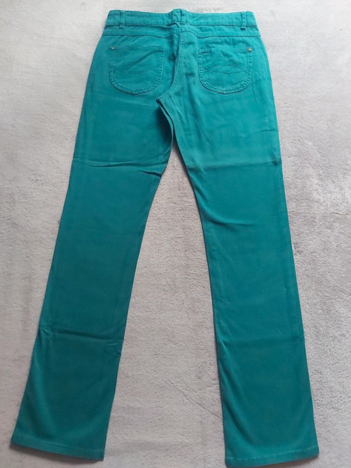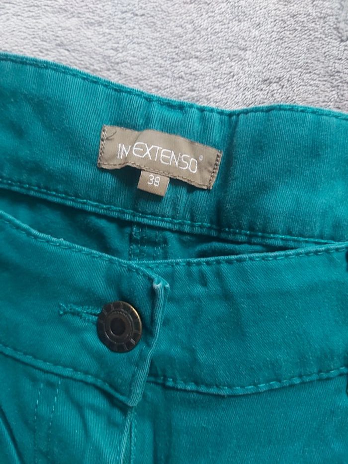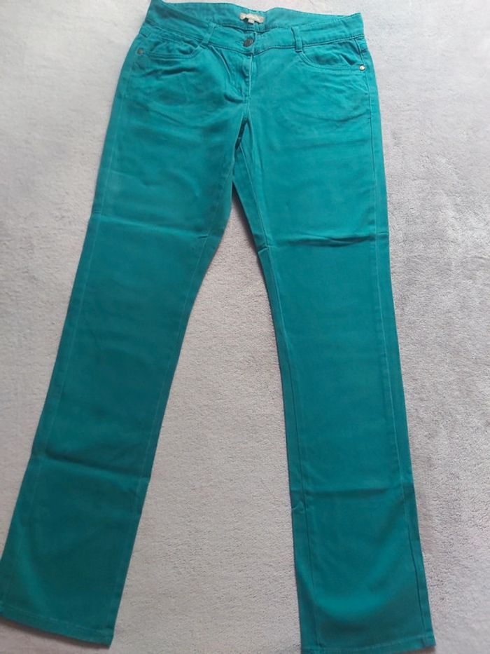 Bonjour, je vends un Jeans vert pour femme. Fermeture à glissière + bouton. 2 poches avant + 2 poches arrière. 98 % Coton 2 % Élasthanne. Taille 38. Marque In Extenso. Prix 5 €.
