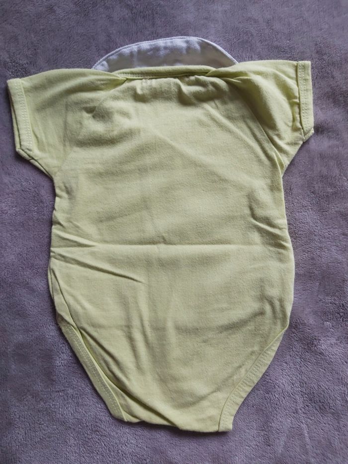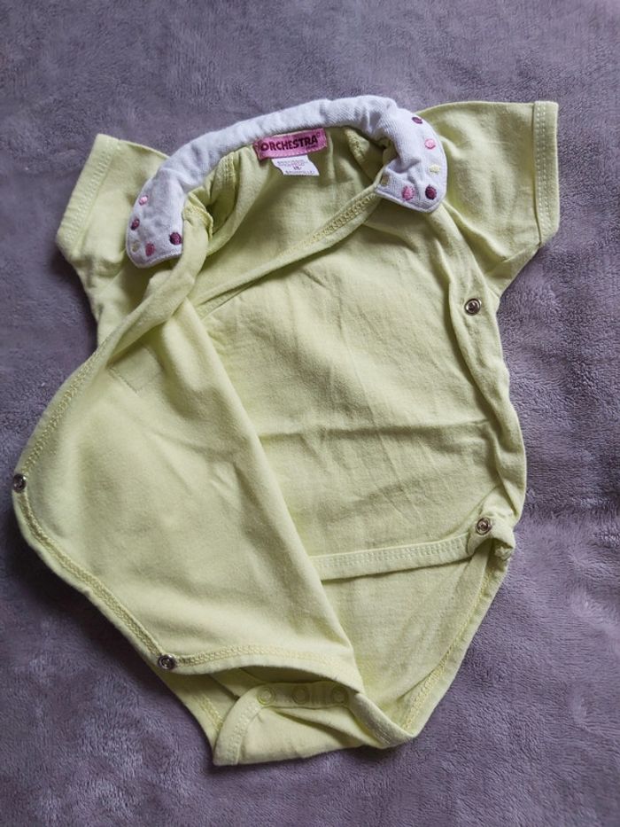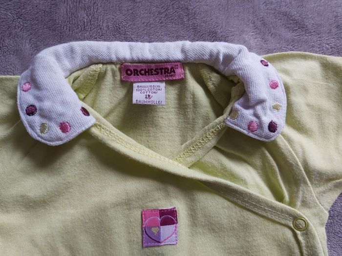 Bonjour, je vends un body vert clair pour fille, avec col blanc à pois de marque Orchestra. 100 % coton. Taille 6 mois / 68 cm. Prix 1 €.