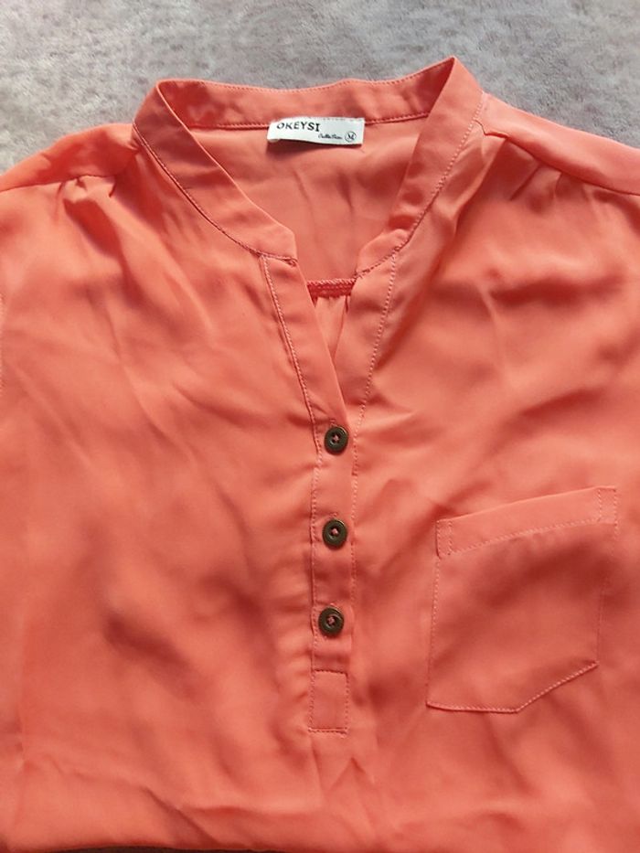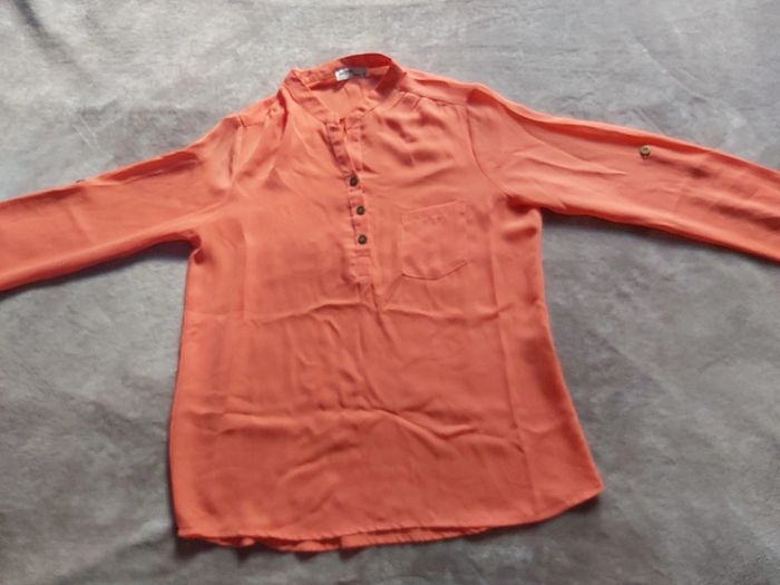 Bonjour, je vends un chemisier femme manches longues Taille M. 1 petite poche sur le devant et 3 boutons au niveau du col. Couleur Rose orangée.