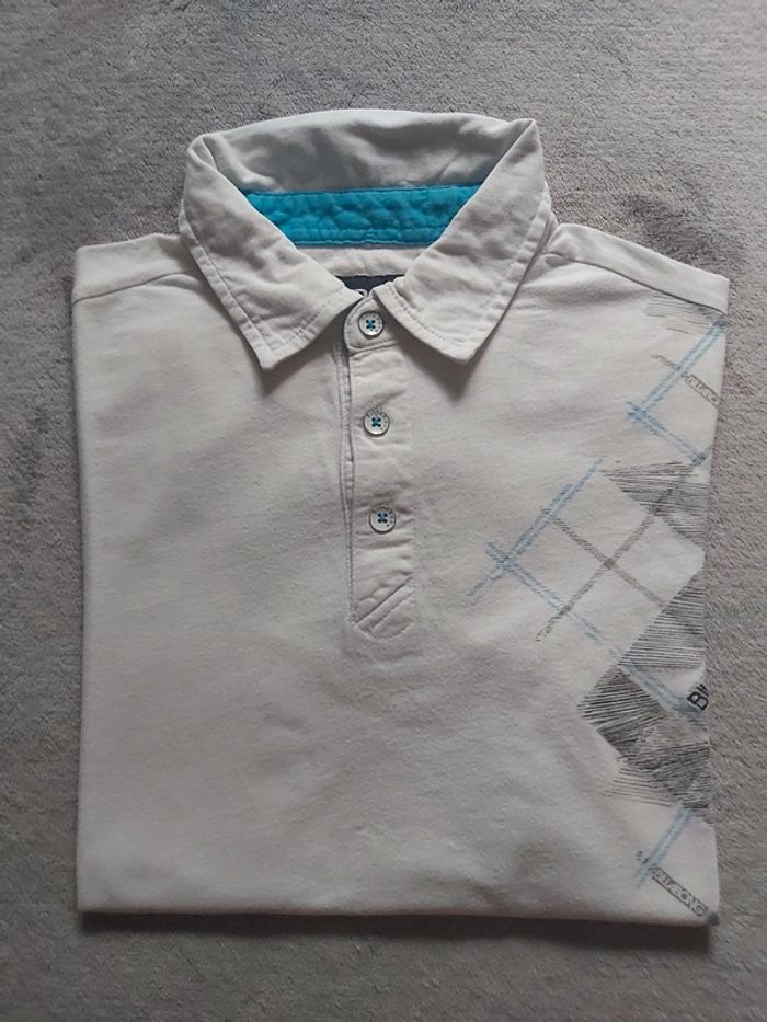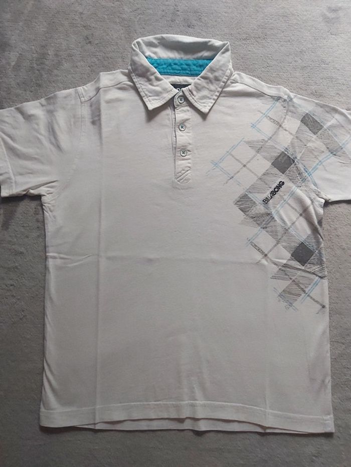 Bonjour, je vends un polo blanc (et un peu noir et bleu). Col avec 3 boutons, manches courtes. Taille 12 ans. Marque Billabong. Prix 2 €.