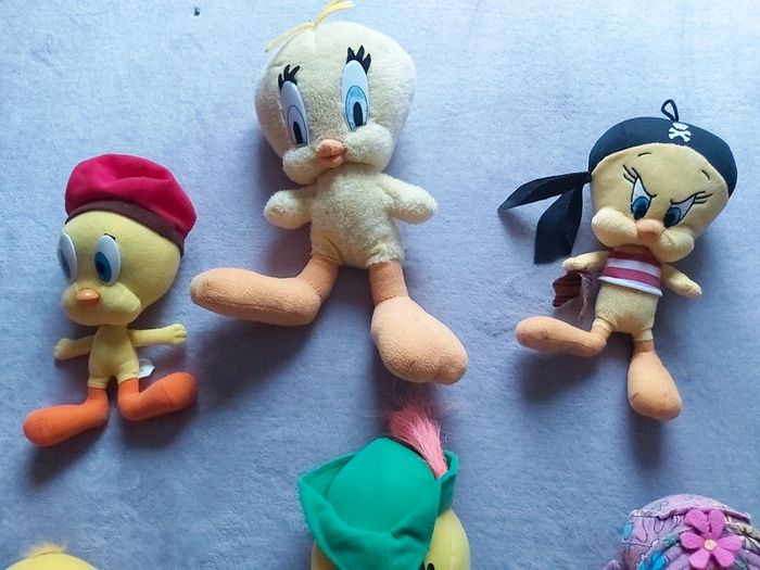 Bonjour, je vends un lot de peluches Titi (Robin des bois, pirate, nu, avec béret, fille avec fleurs, avec cœur...). Différentes tailles. Prix 20 € le lot. Possibilité de vendre au détail.