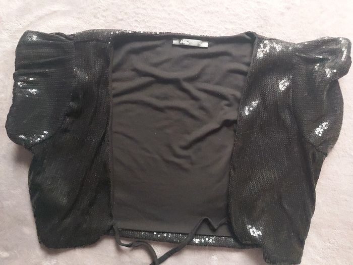 Bonjour, je vends 1 tunique dos nu + 1 débardeur + 1 boléro. Pailleté. Taille 38/40. Prix 10 € le tout.