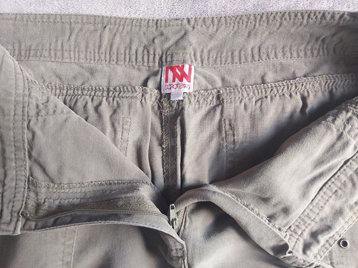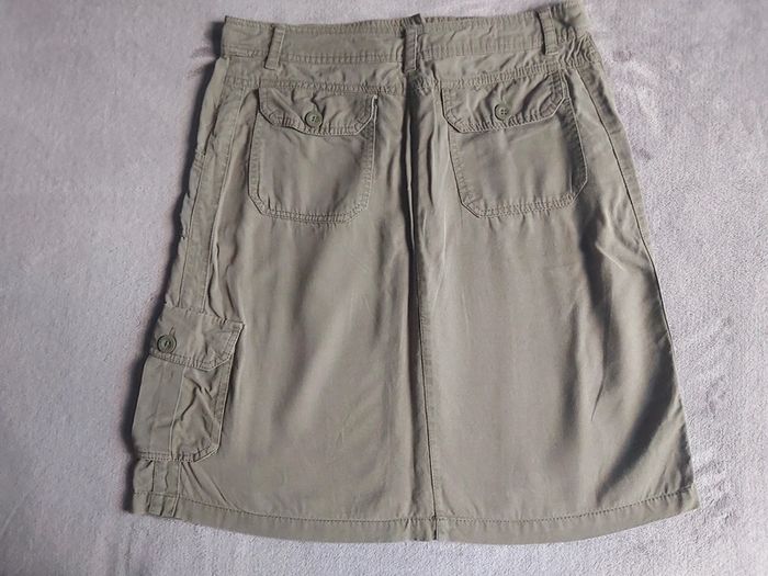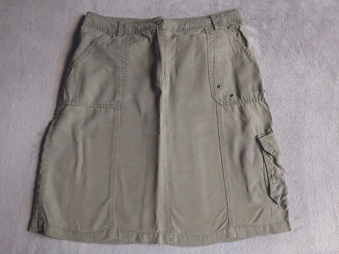 Bonjour, je vends une jupe avec 2 poches avant, 2 poches arrière et 1 poches sur le côté. Fermeture à glissière + bouton. Passants pour ceinture. Longueur 52 cm. Taille 40. Couleur kaki clair. Marque Dorotennis. Prix 3 €.