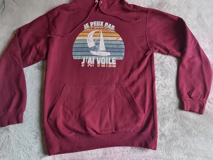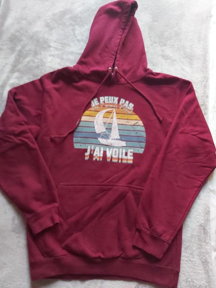 Bonjour, je vends un Sweat à capuche, avec cordon. Couleur Bordeaux, pour homme. Motif "Je peux pas j'ai voile". Taille S. 80 % Coton / 20 % Polyester. Prix 8 €.