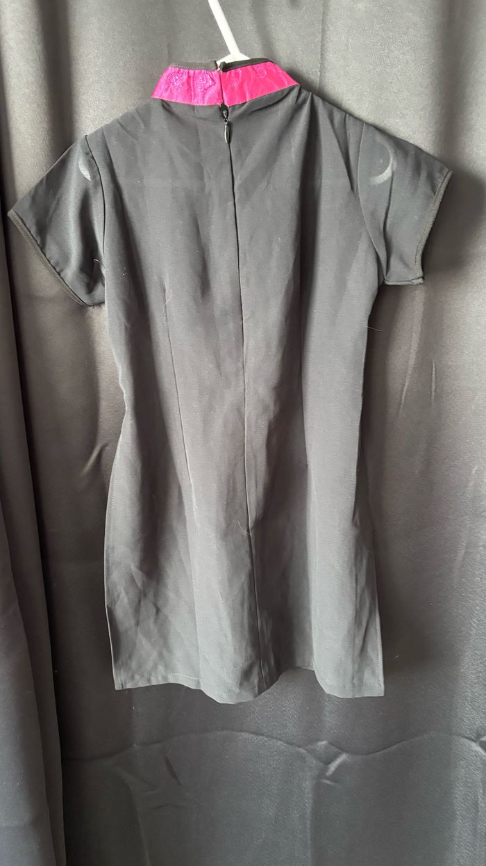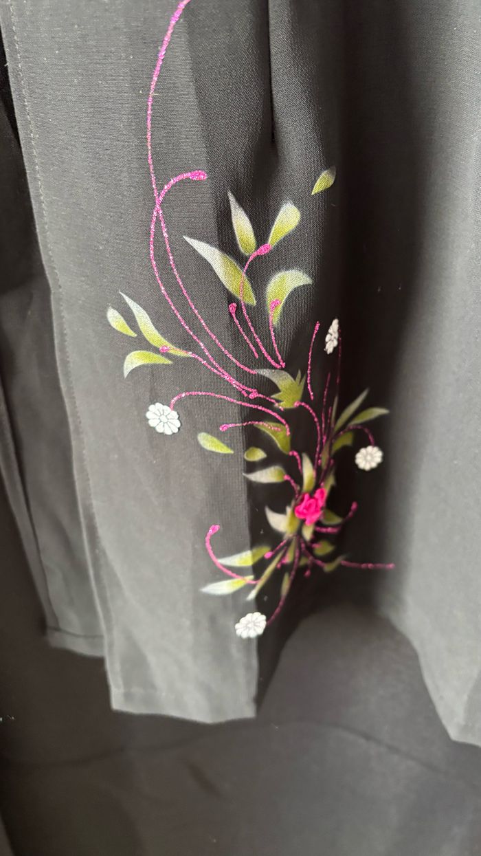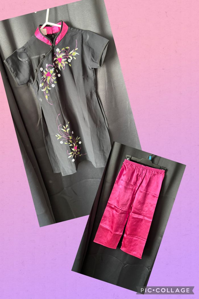 Haut noir avec broderie et voilage et pantalon rose avec taille élastique