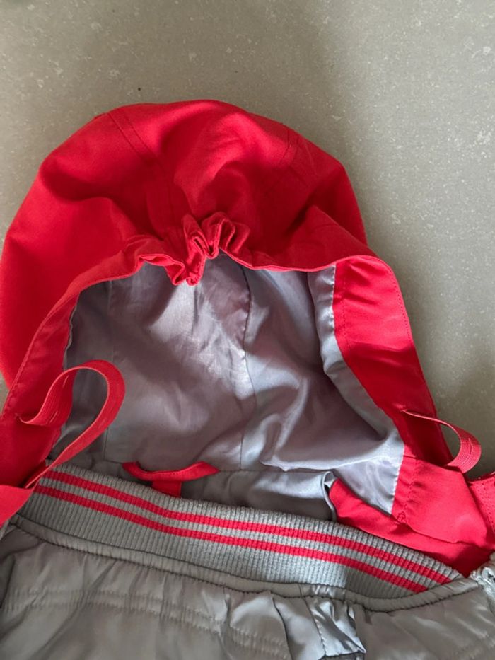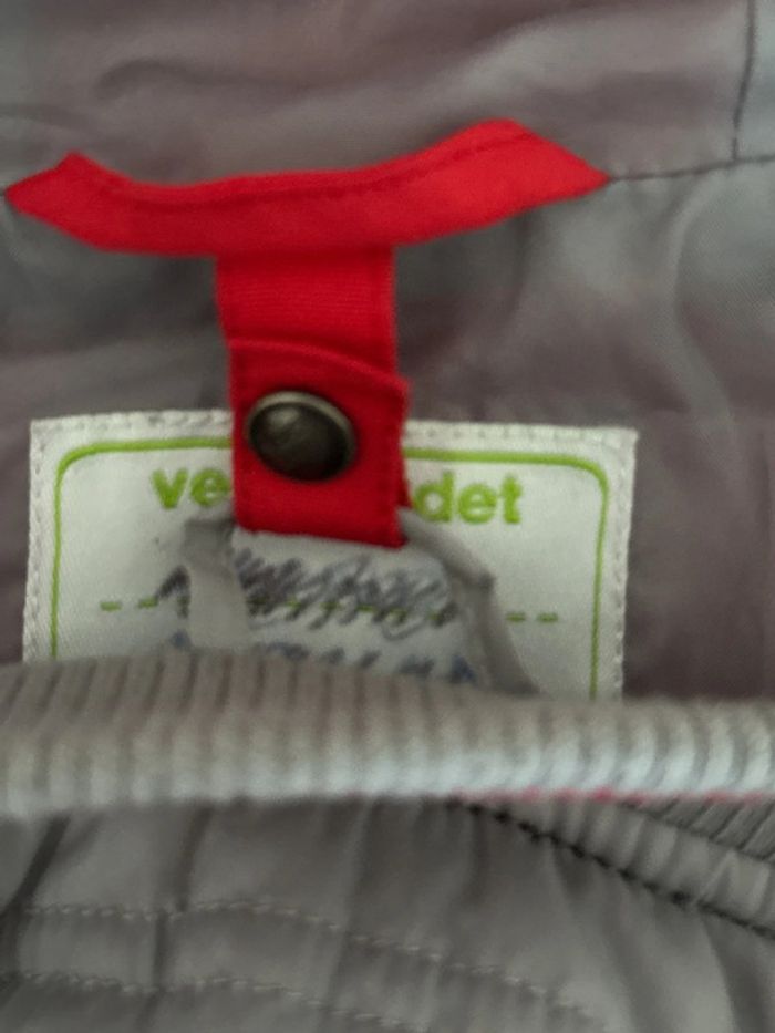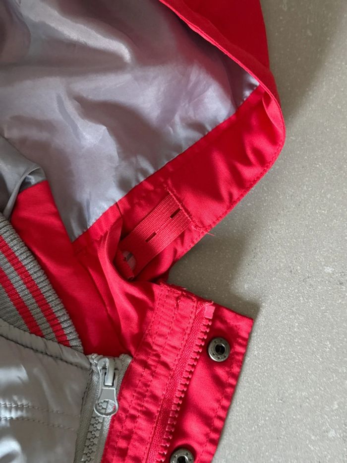Veste 2 en 1 : La doudoune intérieure est amovible et peut se porter séparément. La capuche est ajustable grâce à un élastique, similaire à ceux qu’on trouve habituellement dans les pantalons. deux légers accros à peine visible voire dernière photo.