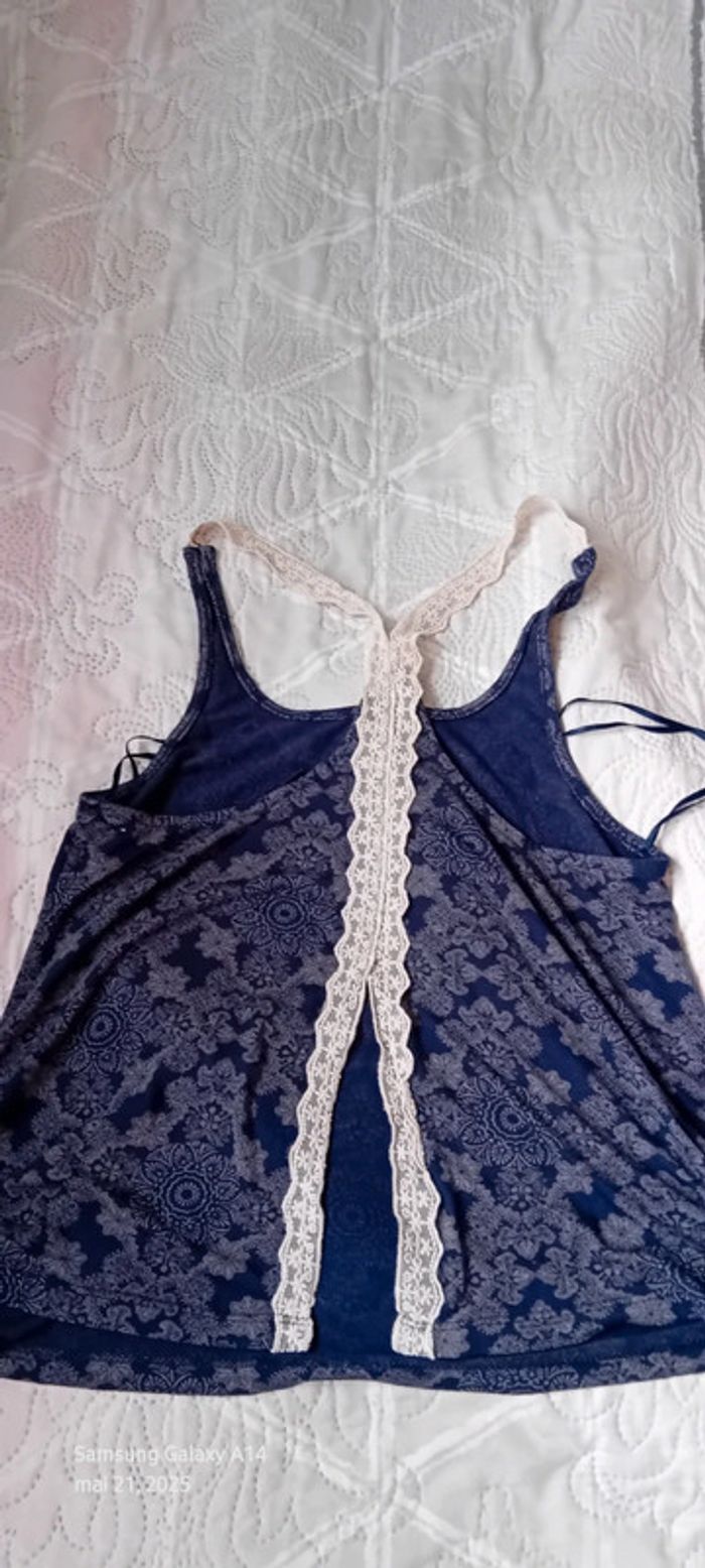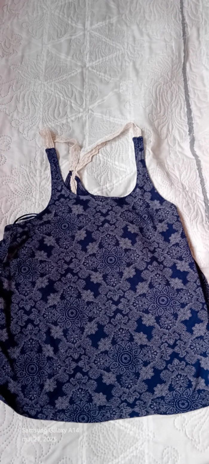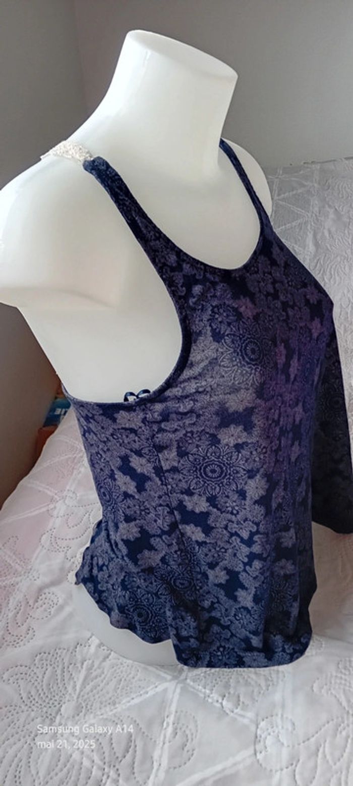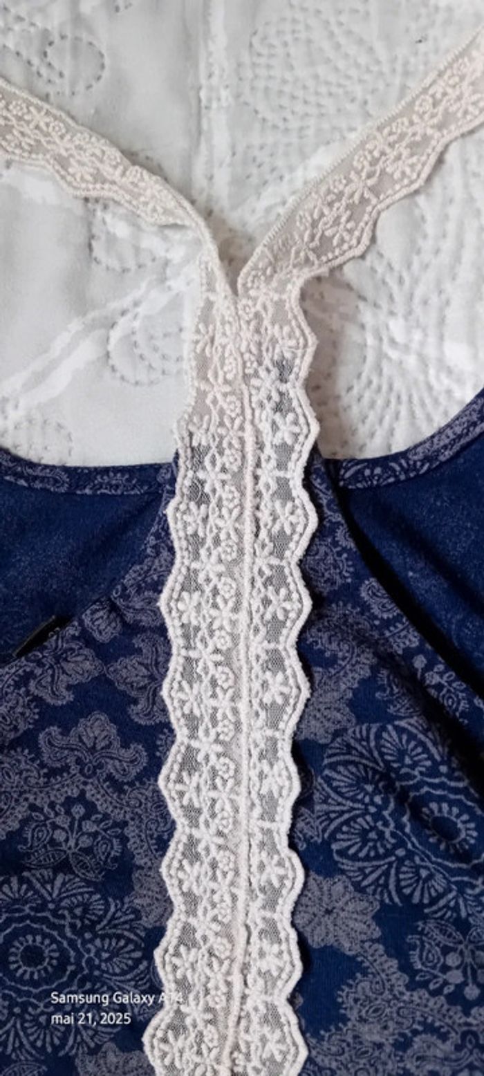 Top fines bretelles avec broderies en viscose et polyester dos nageur ouvert imprimé floral ethnique indien marine et blanc longueur 58 cm largeur aisselles à aisselles 40 cm peu porté en très bon état #midole #midolefemme #midolefemme36 #midolefemmeS #femme36 #femmeS #topépaulesdénudées #hautété #motiffleurs #imprimefloral #impriméindien #imprimeethnique #jennyfer
