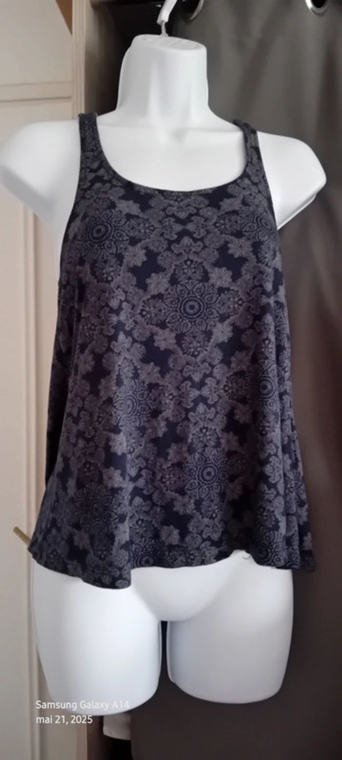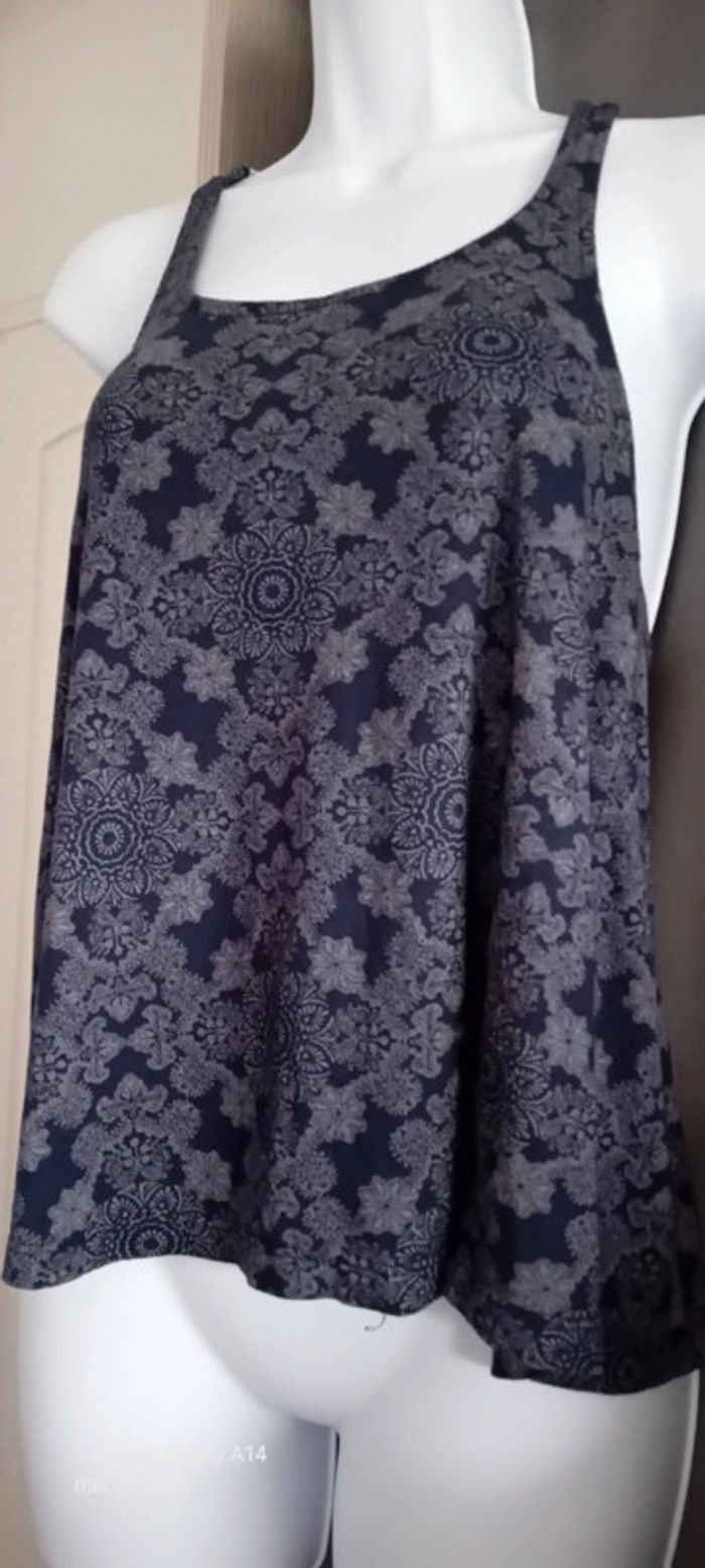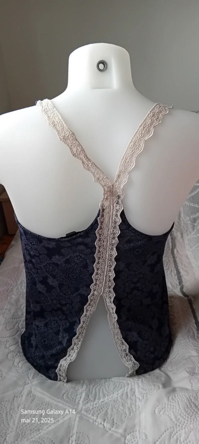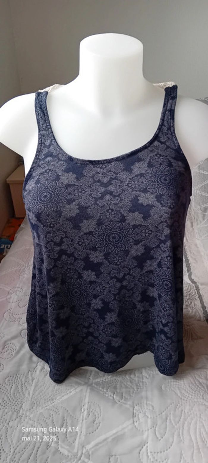 Top fines bretelles avec broderies en viscose et polyester dos nageur ouvert imprimé floral ethnique indien marine et blanc longueur 58 cm largeur aisselles à aisselles 40 cm peu porté en très bon état #midole #midolefemme #midolefemme36 #midolefemmeS #femme36 #femmeS #topépaulesdénudées #hautété #motiffleurs #imprimefloral #impriméindien #imprimeethnique #jennyfer