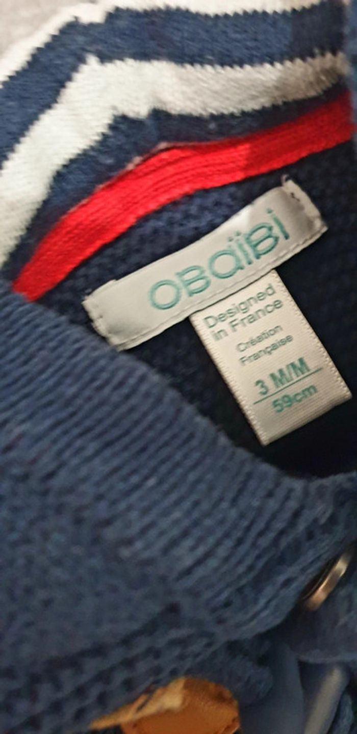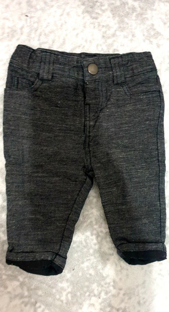 Très bel ensemble pour bébé garçon d'un mois comprenant Jean noir irisé 1 mois et gilet bleu marine avec pièces en cuir marron en taille 3 mois.