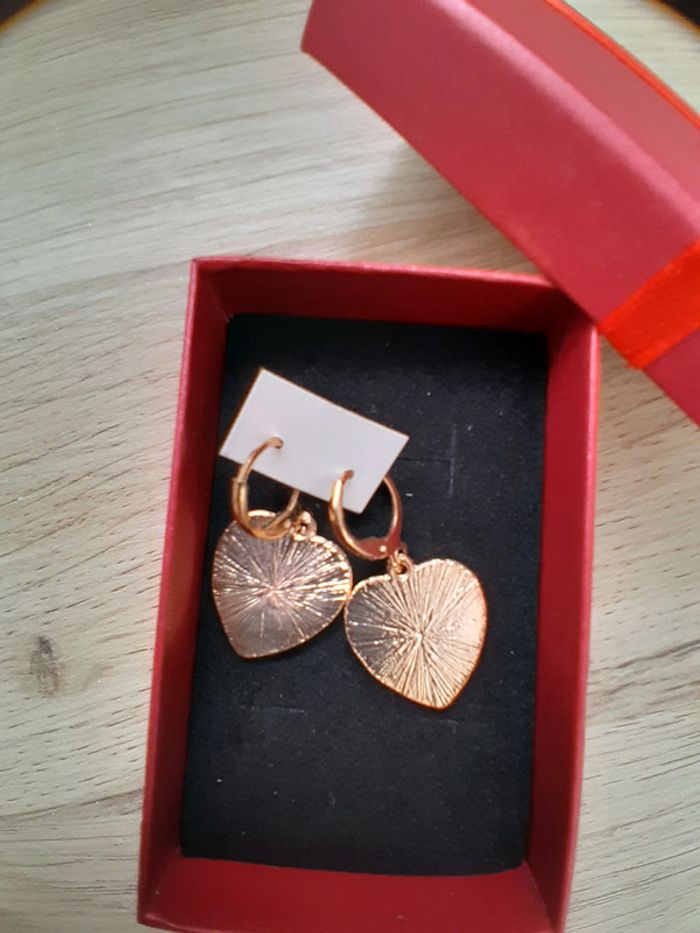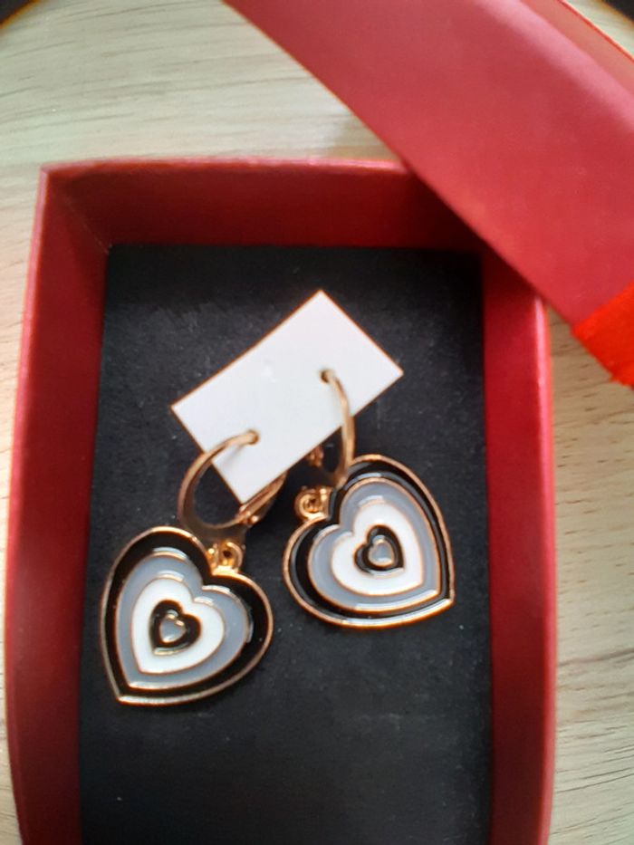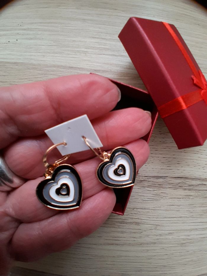 Boucles d'oreilles, coeurs émaillées, couleurs noir, gris et blanc, dorées hauteur : 3,5cm neuves