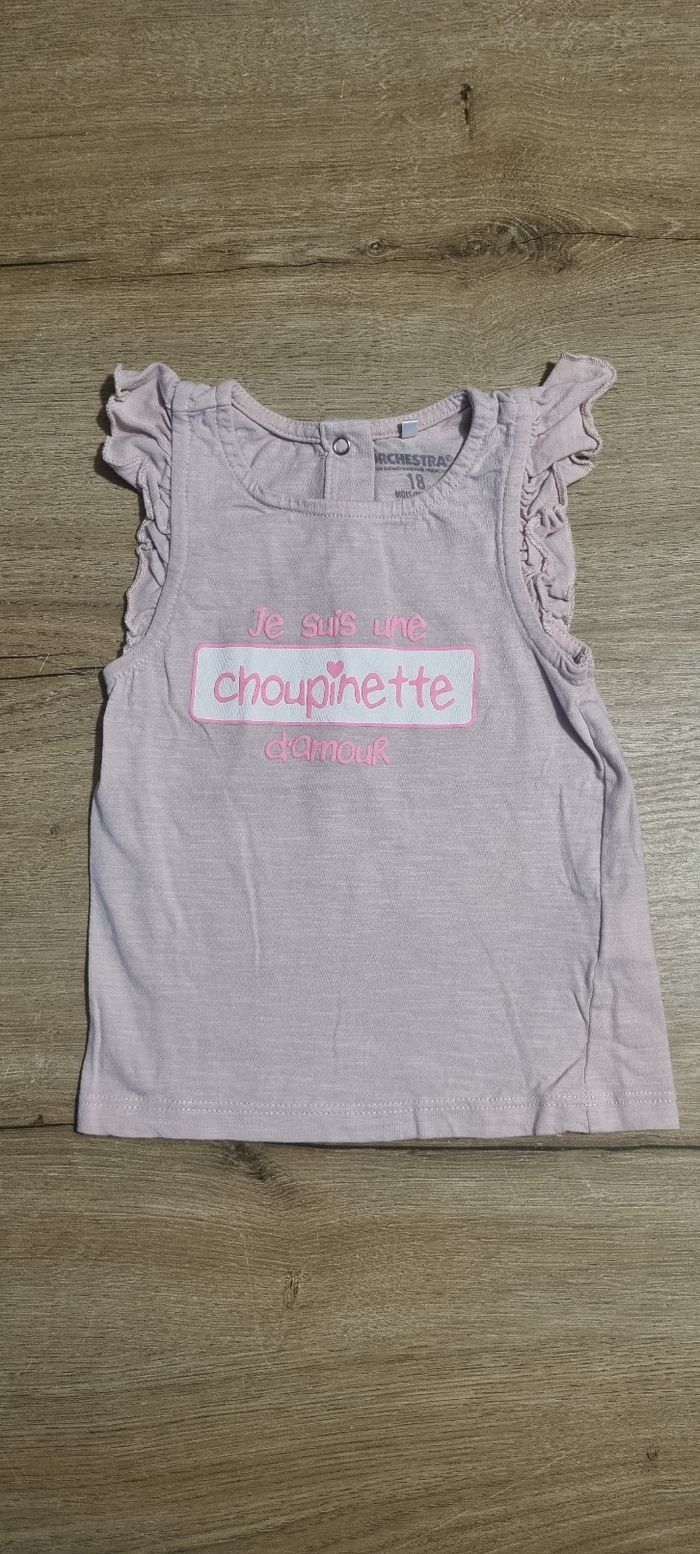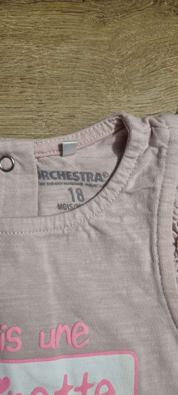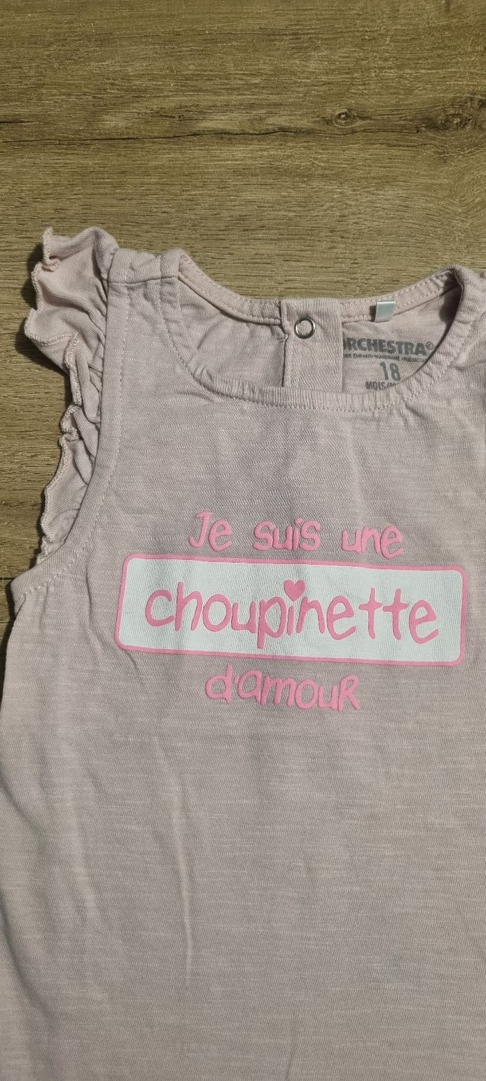 T-shirt à manches courtes avec manches volantes Écriture "Je suis une choupinette d'amour" Orchestra taille 18 mois mais taille petit Très bon état