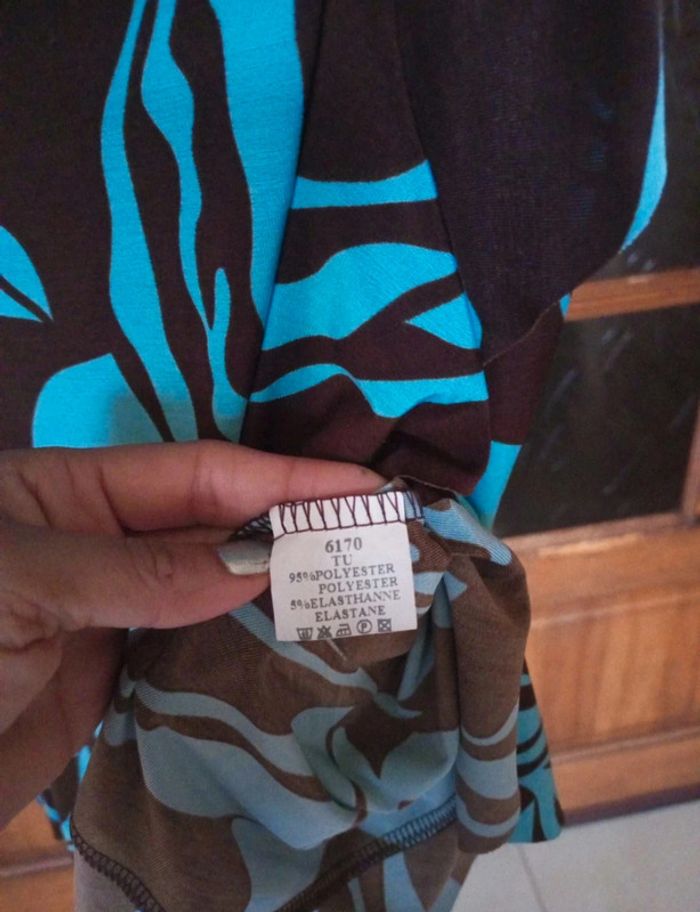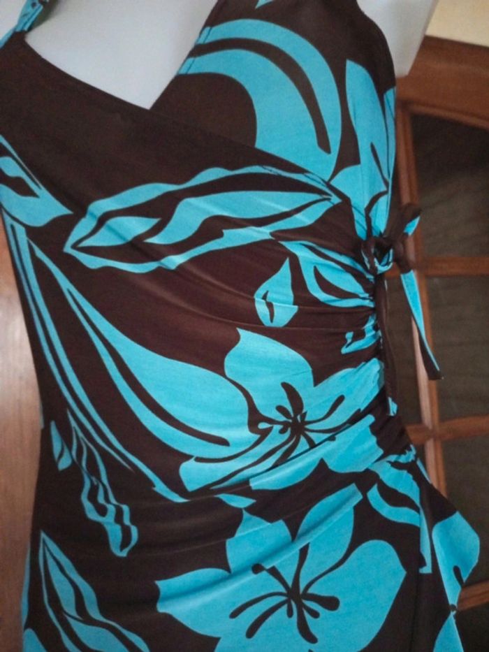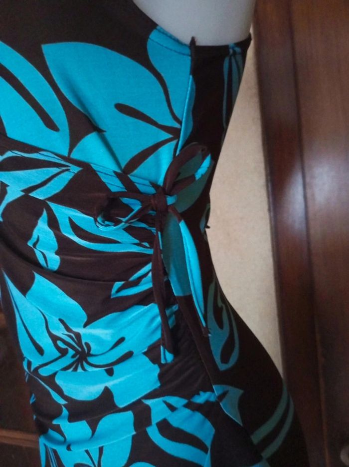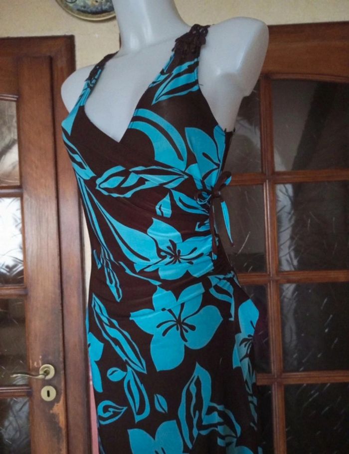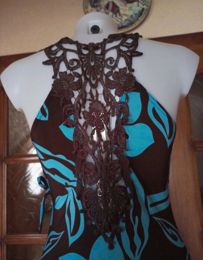 Magnifique robe d'été , fluide en polyester ,elasthanne coloris turquoise et chocolat , tres féminine . dos en dentelle macramé coloris chocolat. Longueur mi mollet marqué TU, peut convenir Pour 40/42 sans probleme. Pour plus de renseignements n'hésitez pas 😉